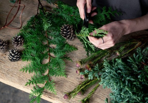 既製品の販売や、最終の飾り付けのみを行うお花屋さんも多い中、イクス・リフトでは、1点1点を完全ハンドメイドで心を込めてお作りすることを大切にしています。香り高いフレッシュな素材を用いるため、同じ商品でもひとつひとつ表情が異なります。その素材の特徴やクセを見抜いて、その素材が最も美しくなる位置や向きに配置。大切に飾っていただけるよう、シーズンの制作中は松脂で手を真っ黒にしながら、丁寧に制作します。