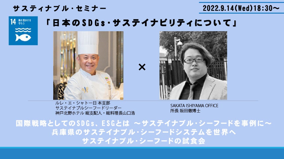 そしてこの度、SDGs活動の第2ステージとして、9月14日(水)神戸北野ホテルにて“サステイナブル・セミナーと試食会”を開催することとなりました。セミナーでは、国際連合でのSDGsに関する国際講演、学術書の出版実績のある「阪田徹博士」と、サステイナブル・シーフードの世界的権威団体であるフランス・パリのルレ・エ・シャトー日本支部サステイナブル・シーフードリーダーである「山口浩」の2名が登壇。