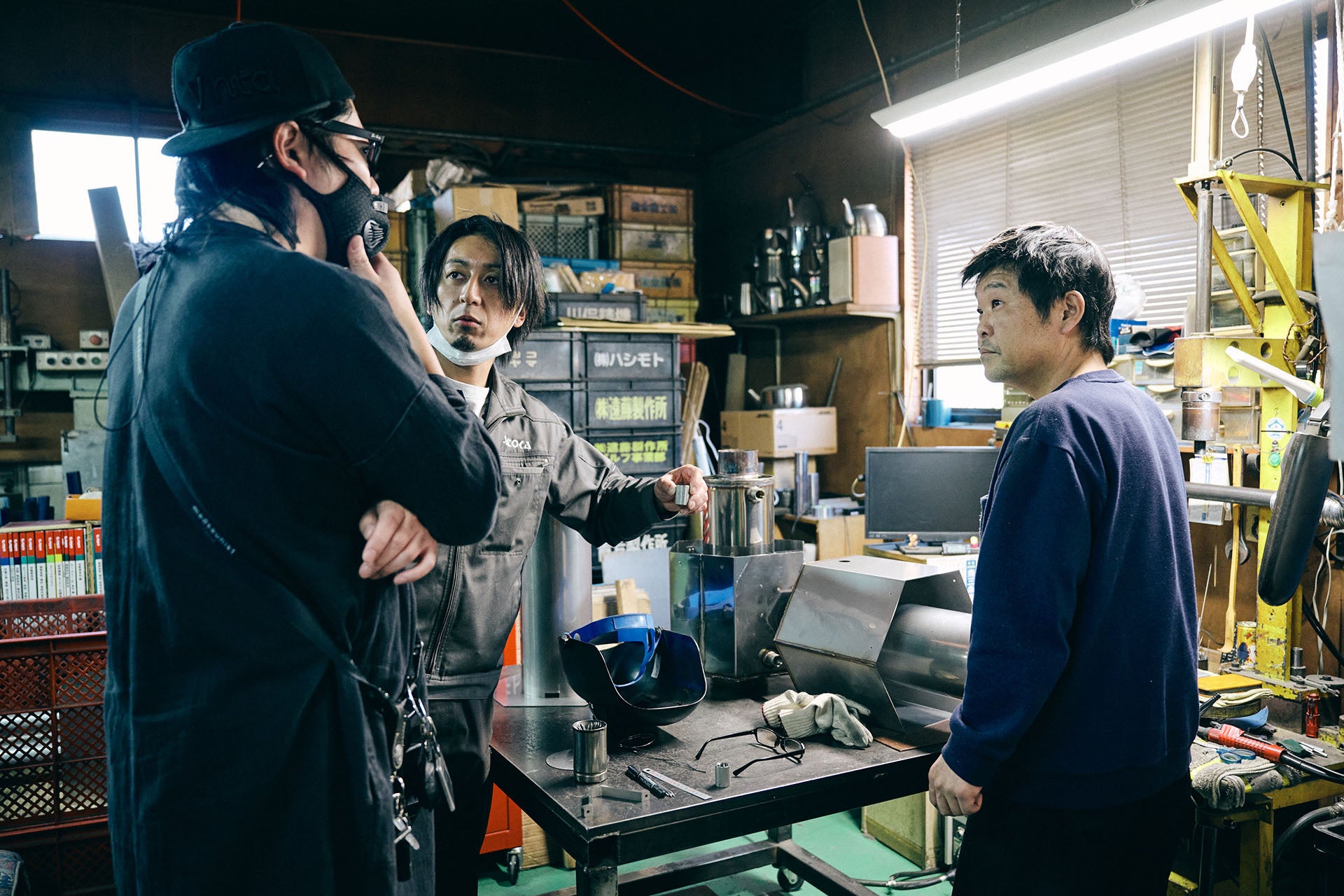 同行していたのは、まさしく業務発注を行おうと考えている、サウナプロデューサーのmadsaunist(マッドサウニスト)氏。テントサウナで使用する新型のスチームジェネレーターの製造先を探していたところ、NK溶接の技術を知り、ツアー当日、試作機の打ち合わせで両者が対面しました。