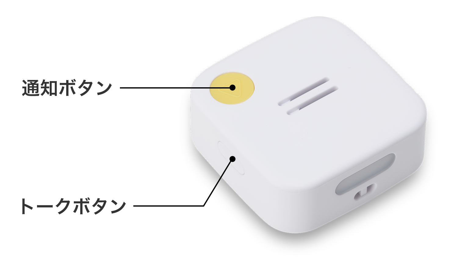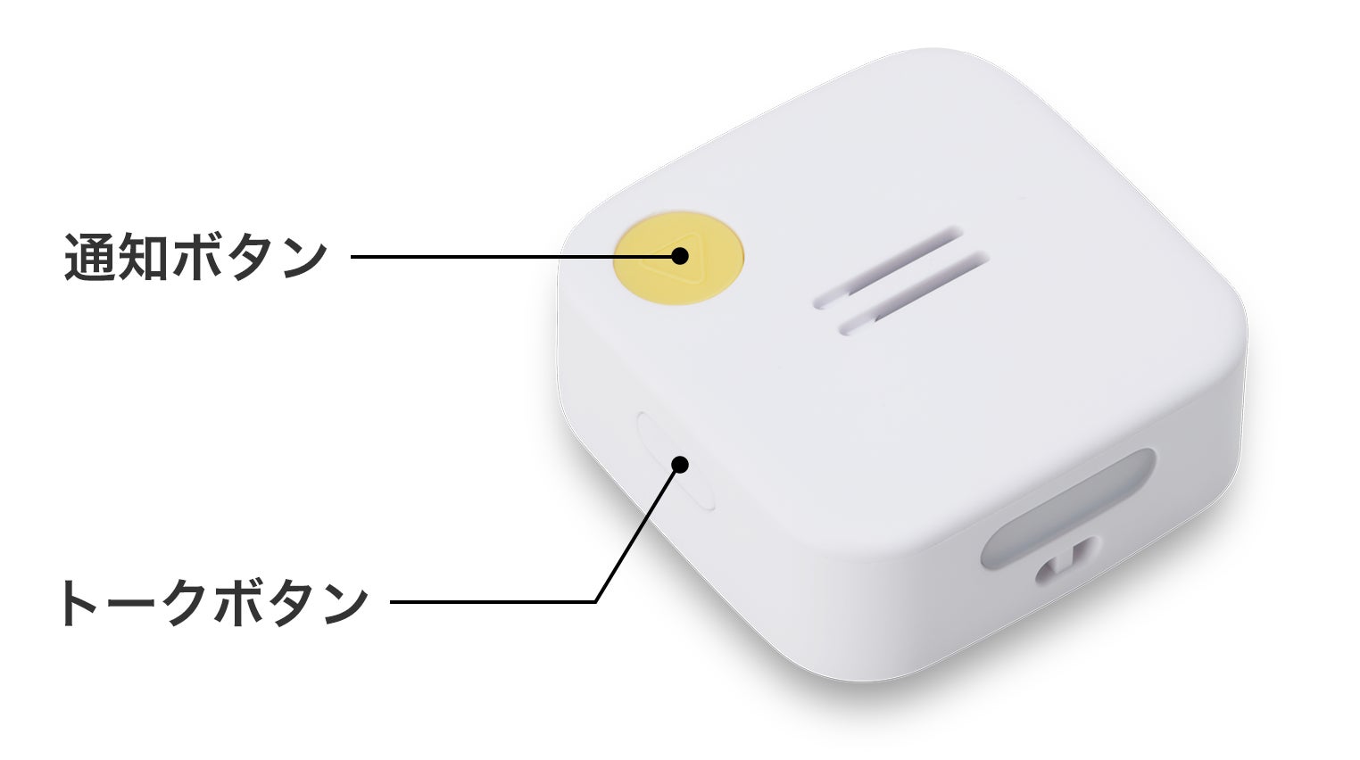 保護者に現在地を伝える「通知ボタン」と音声メッセージを送信する「トーク」専用ボタンを搭載。トークボタンを本体側面に配置し押し間違いを防ぐ設計にしました。