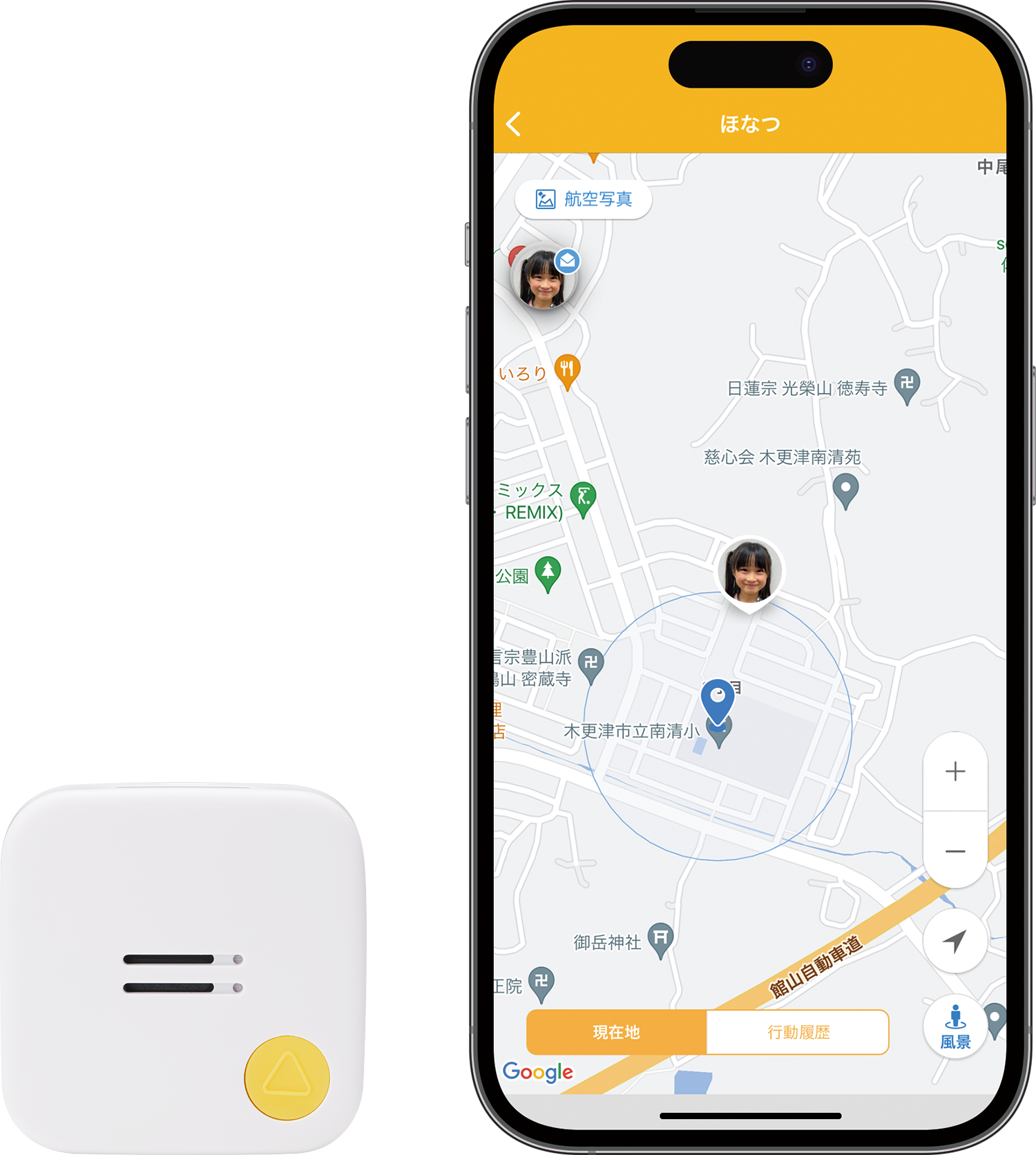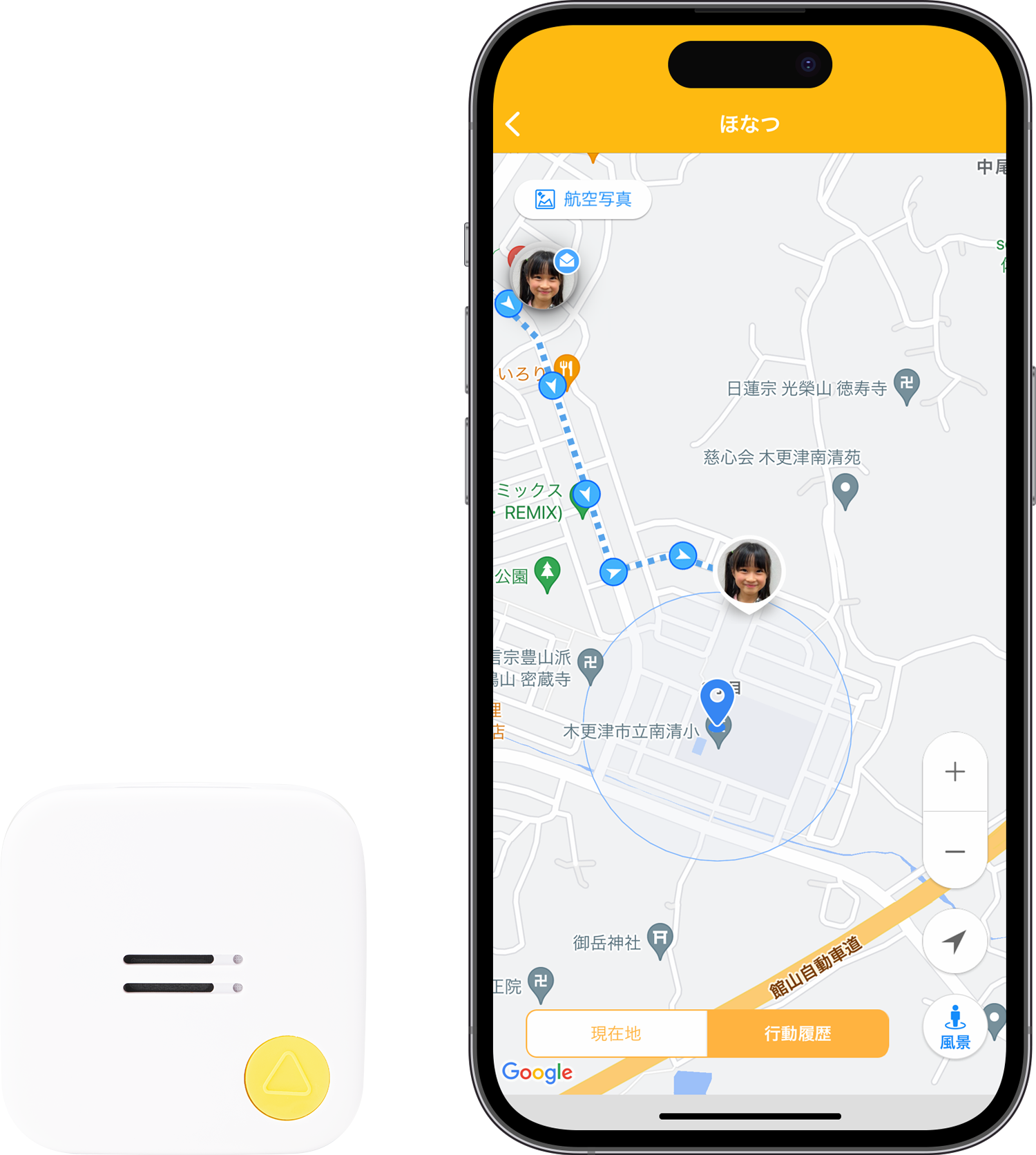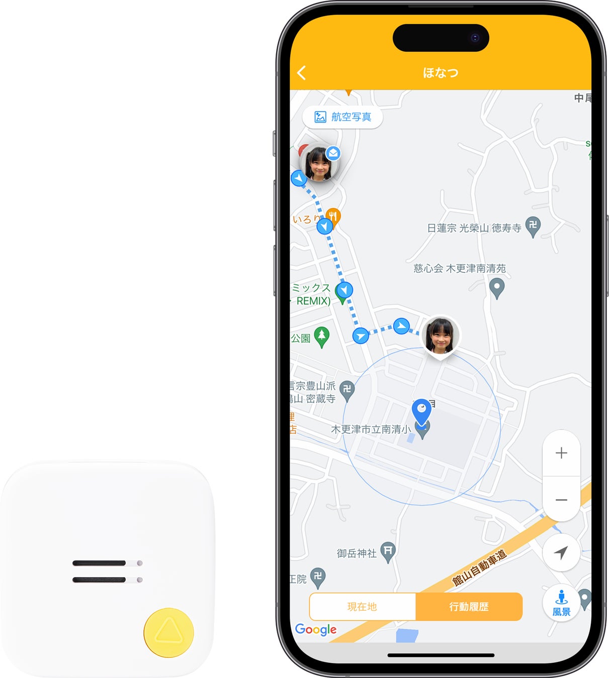 世界各国のGPS衛星、A-GNSS、Wi-Fi、L1/L5デュアルバンド等を利用した高精度の測位方式により、測位が難しい地下や屋内でも子どもの居場所の特定が可能に(※)。最短1.5分間隔で現在地を自動サーチするので、スマートフォンアプリを開けば現在地と移動経路が瞬時にわかります。