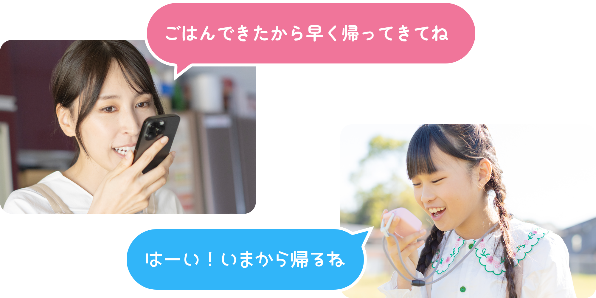 子ども側、スマートフォン側それぞれで音声を送り合うことができるので、離れていてもお互いの声が聞けて安心です。