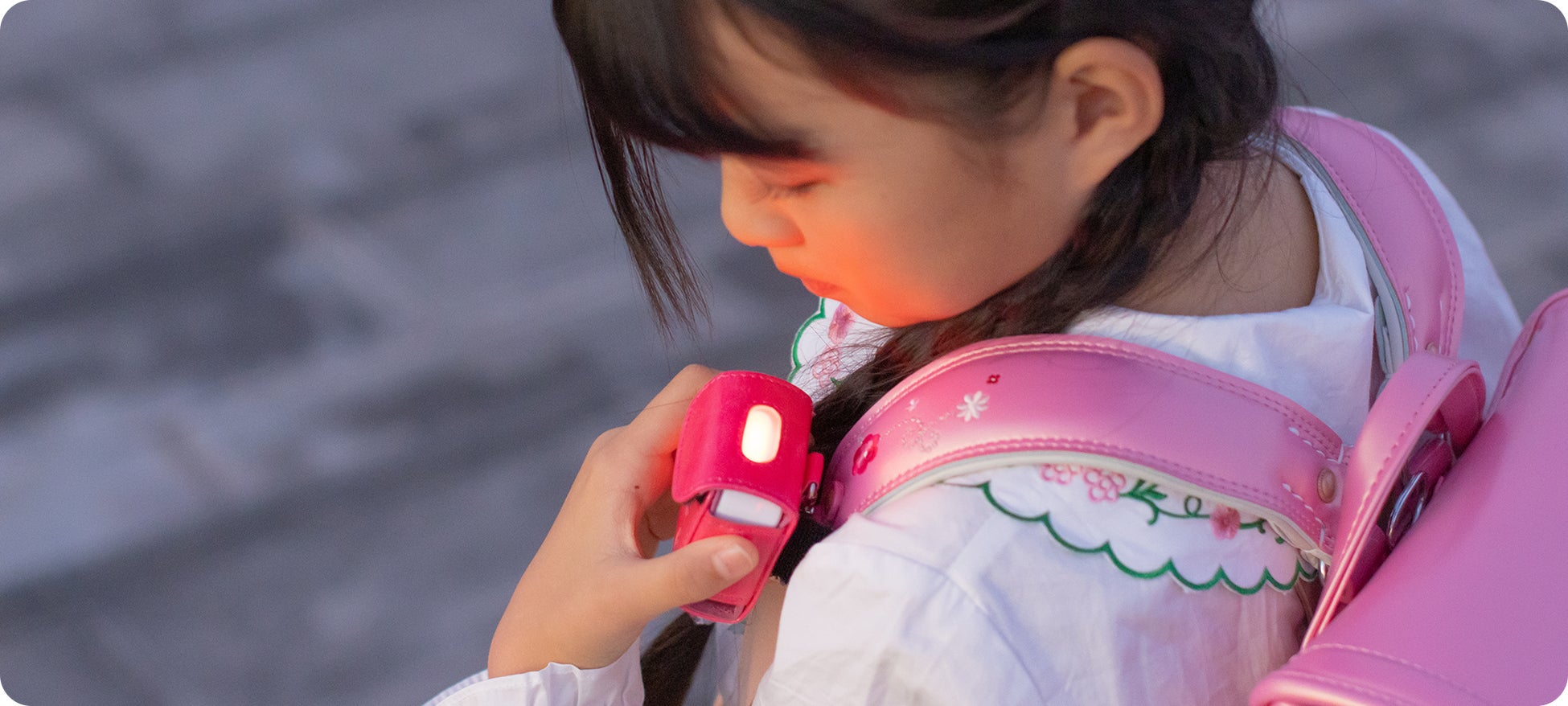 大切な通知にすぐに気づいてもらいたいから、ランドセルの肩ベルトに『みもり』を取り付けている場合でも通知の点滅が子どもの視界に入るように大型のLEDランプを搭載(※)。