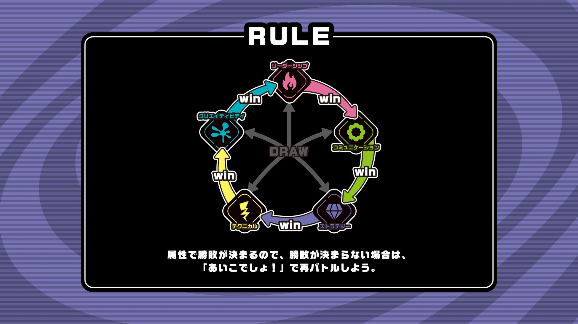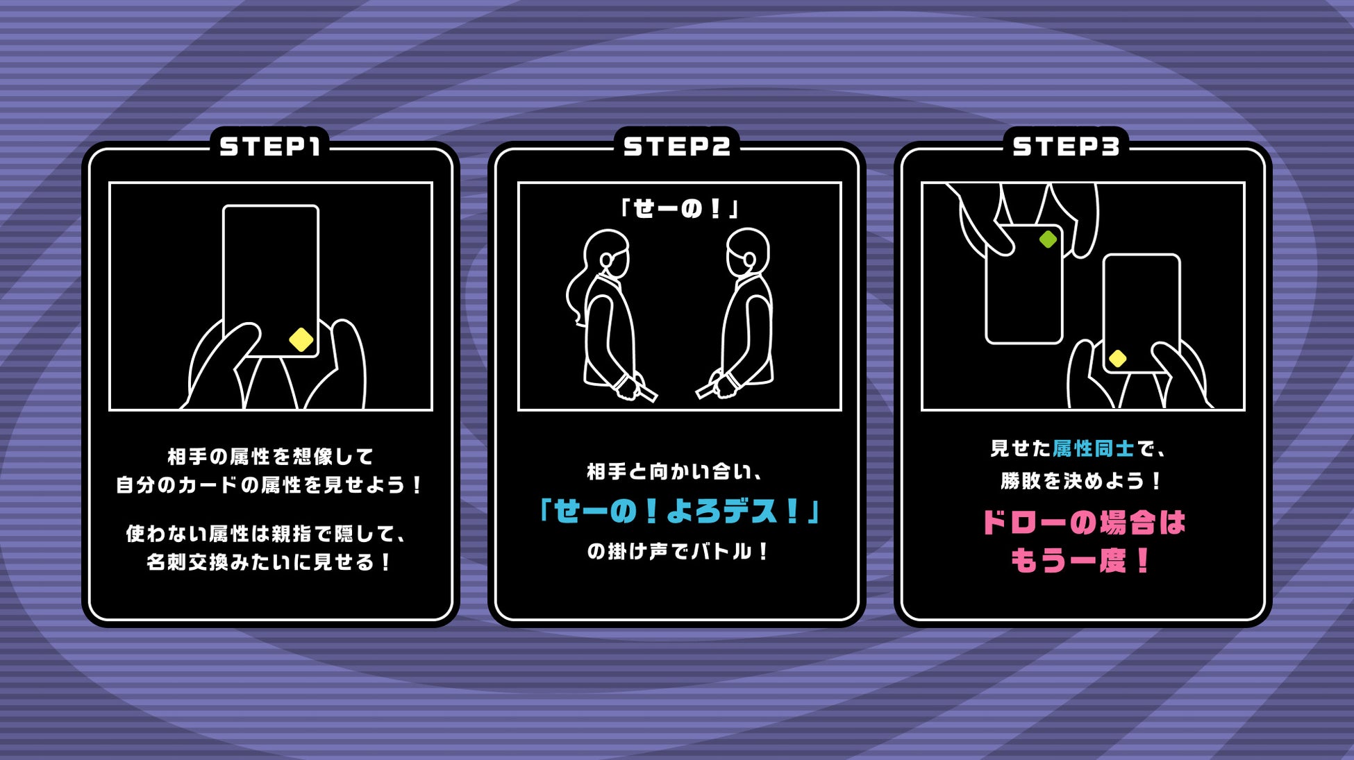 ビジネスマンの武器である顔と名刺・・・。これらの情報のみでAIがあなたをキャラクターに変身させ、その場でトレーディングカードにするAI生成エンターテインメントコンテンツです。キャラクターにはそれぞれ「炎:リーダーシップ (Leadership)」「水:クリエイティビティ (Creativity)」「地:ストラテジー (Strategy)」「雷:テクニカル (Technical)」「草:コミュニケーション (Communication)」の属性が名刺や顔情報から与えられ、その属性を使ってキャラクター同士カードバトルさせて楽しむことができます。掛け声は・・・「せーの!よろデス!」