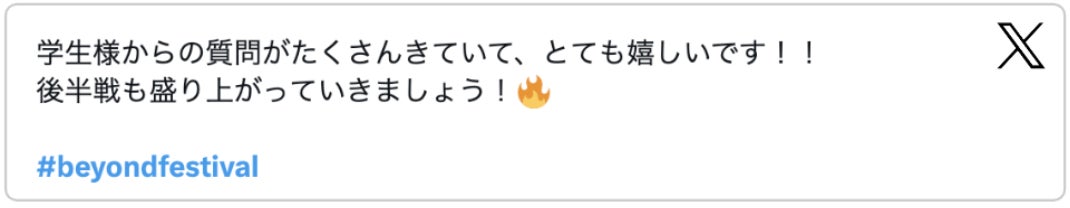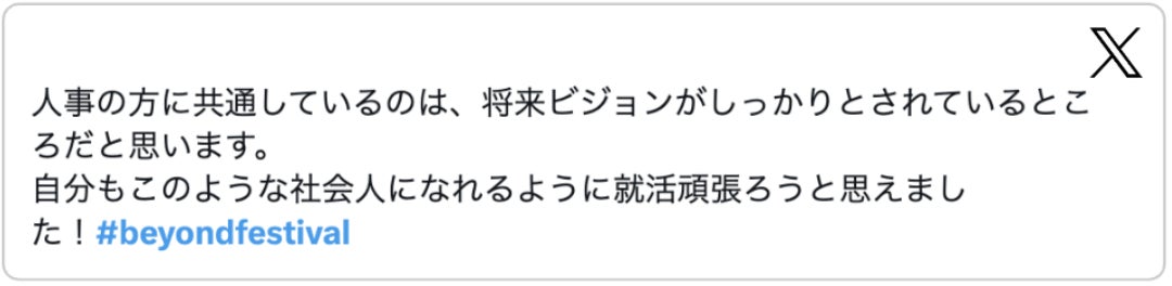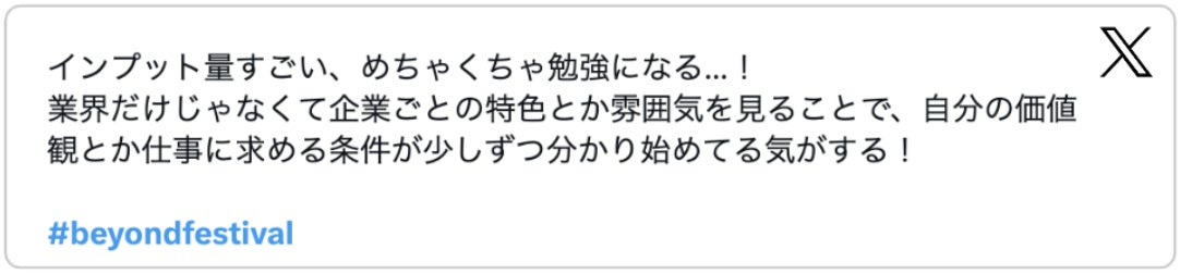 今回も素敵なイベントに参加させていただきありがとうございました!弊社が考えている「本質的な働き方」が貴社がイベントの最初に案内された「働く時間」のコンテンツと内容がほとんど同じなので、学生さんに対してコミュニケーションが非常に取りやすかったです! |
