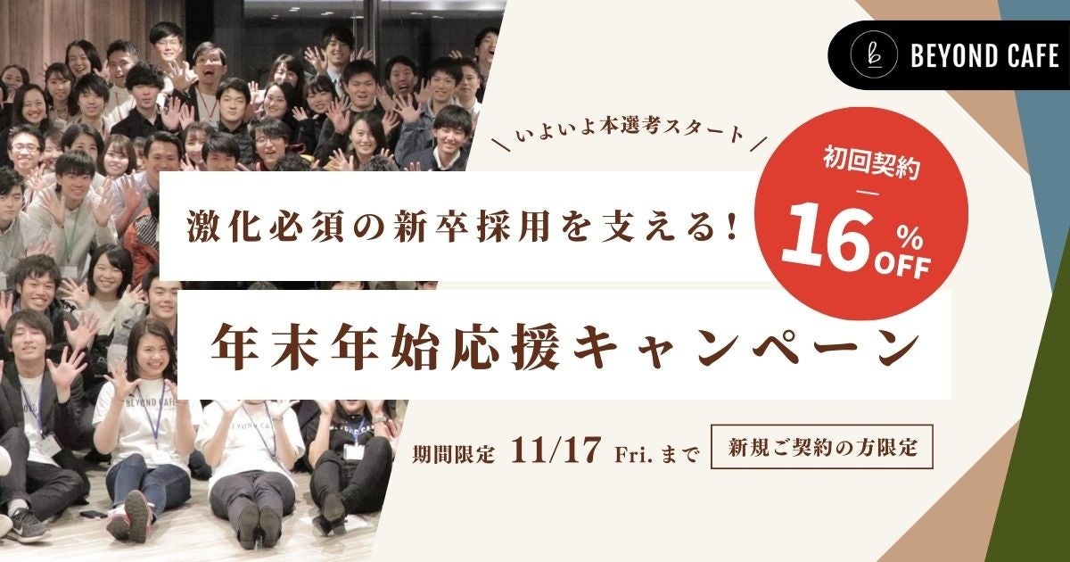 本キャンペーンでは、2023年11月1日(水)~2023年11月17日(金)に「BEYOND CAFE就活イベント」を新規お問い合わせいただく企業様へ、初回契約費用(※1)を16%オフでご提供します。