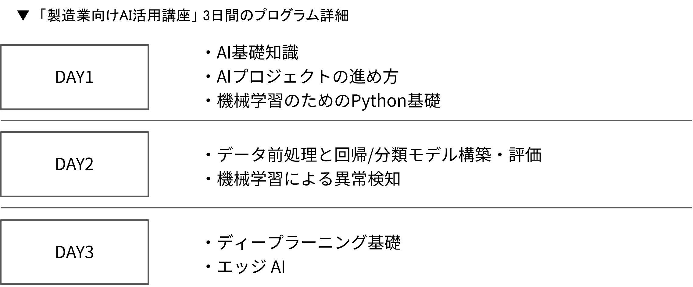 製造業におけるAIプロジェクトの需要が高まる中で、AIを自社開発するニーズも増えつつあります。一方で、経済産業省の発表では、2030年には約14.5万人のAI人材が不足すると言われております。本講座では、AIの基礎知識、AIプロジェクトの運用方法、Pythonを用いた機械学習のためのハンズオンなどの講習を行います。講座を通して、AI導入の道筋をつけられる人材を育て、AIを自社で開発出来る企業を増やしてまいります。