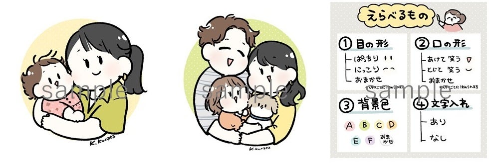 内容:写真を元にご家族のイラスト作品を制作。人物ごとの目の形や、イラスト背景色・文字入れ等をオーダー可能。