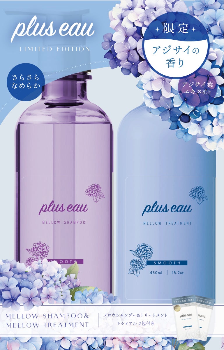 シルク*³&カシミヤケラチン*⁴配合で、とろける質感と感動の指通りへ導く、プリュスオーメロウシャンプー&トリートメントから、夏季限定「アジサイの香り」が数量限定で発売。ダメージケアはもちろん、洗い上がりの“髪の質感”にこだわり抜いた処方で、毛髪補修成分が髪の内側まで浸透補修。柔らかな手触りの“スルふわ素髪”に仕上がります。