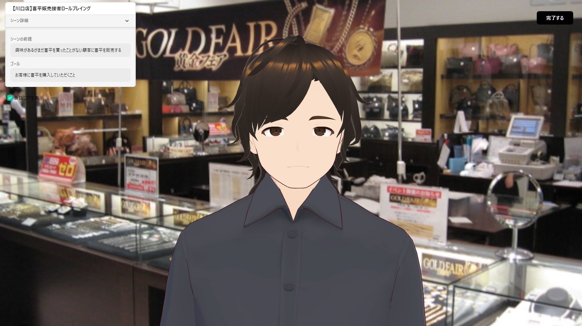 AIロープレに①で定義したハイパフォーマーの接客術を組み込み、AIアバターをお客様に見立てて実際の接客シーンを体験できるプログラムを構築しました。対話型トレーニングにAIアバターを活用することで、スタッフは場所や時間を問わず、ヒアリング力やお客様からの質問に適切に対応するスキルを効率的に習得できるようになりました。