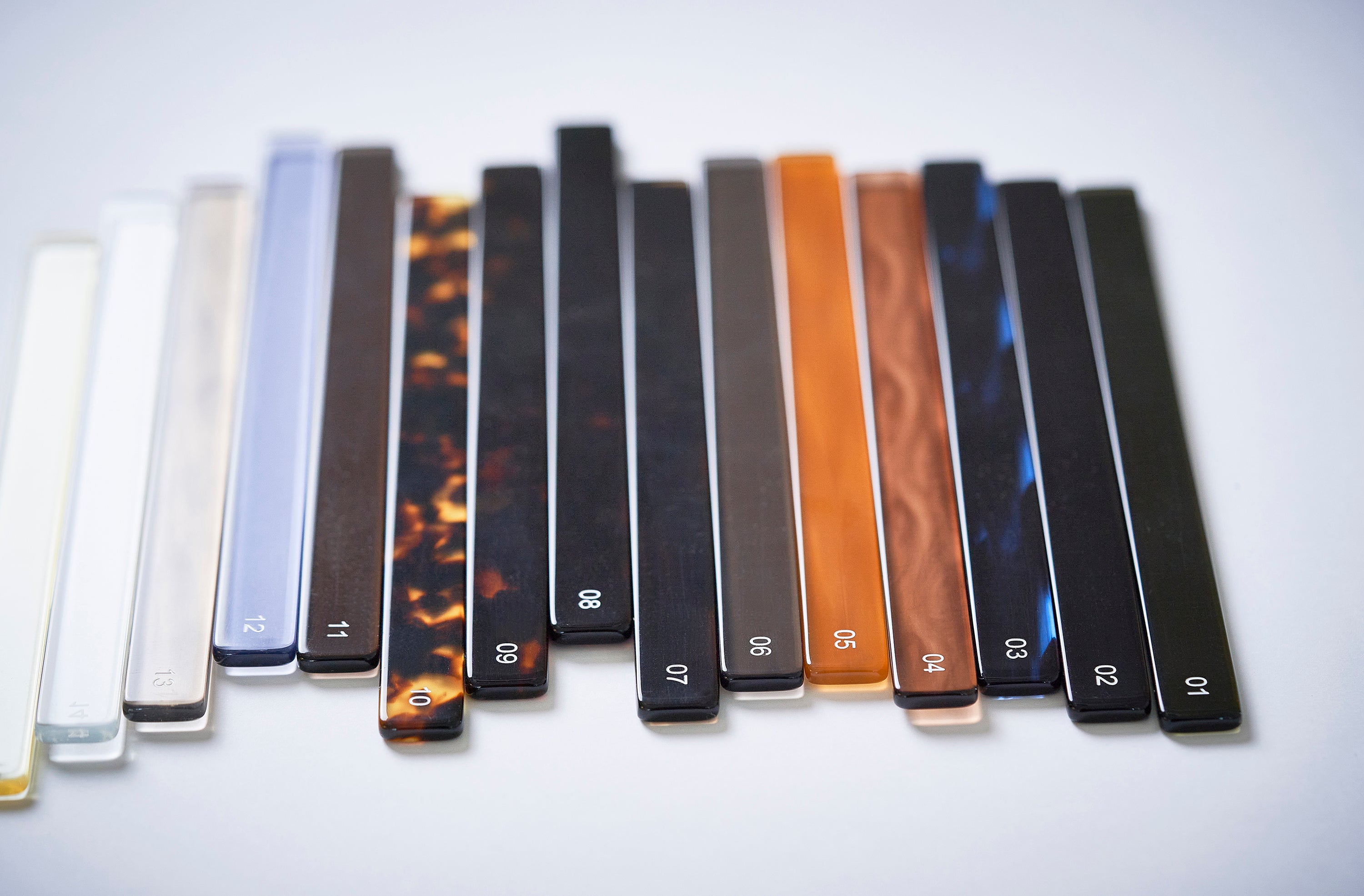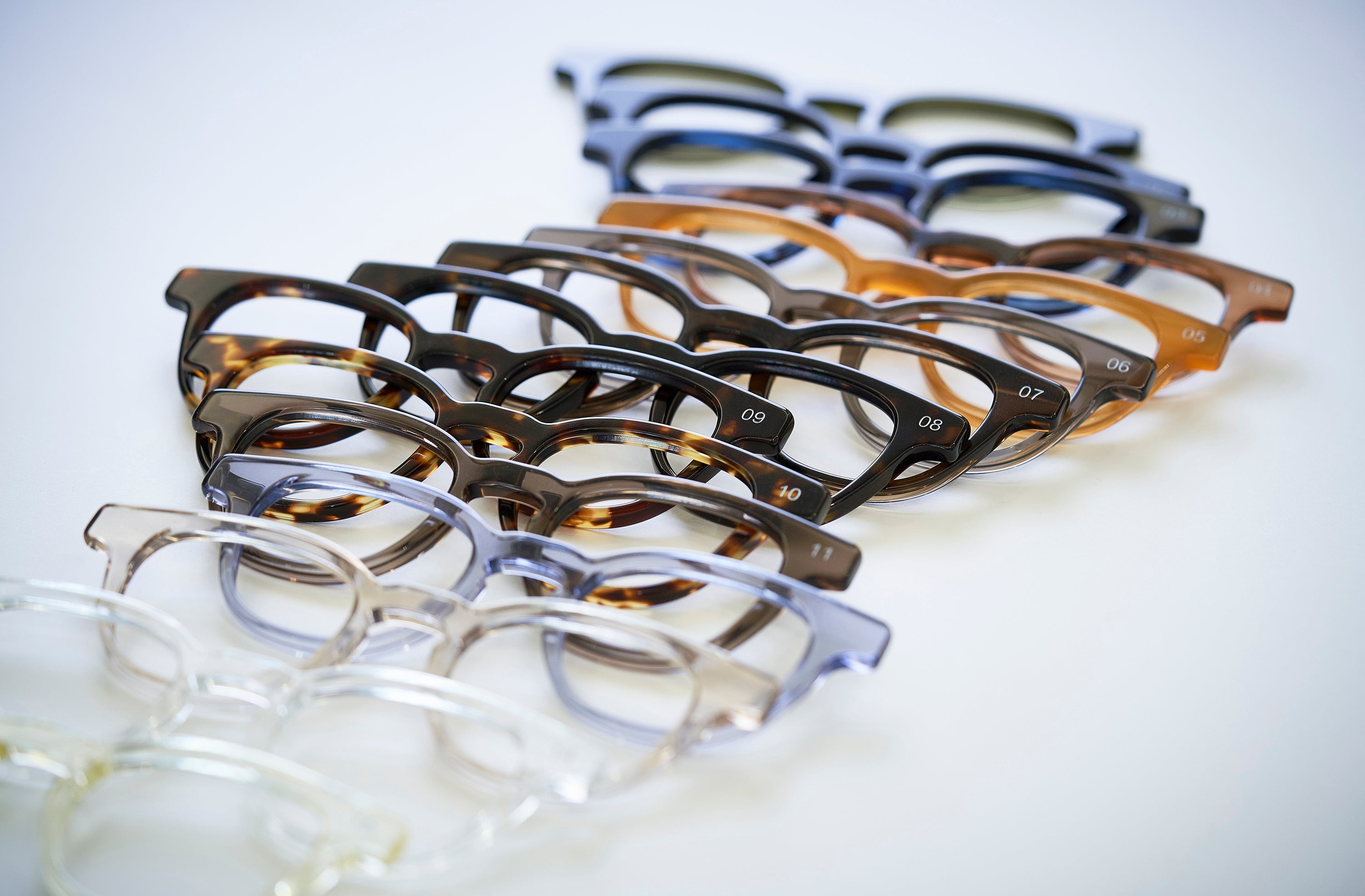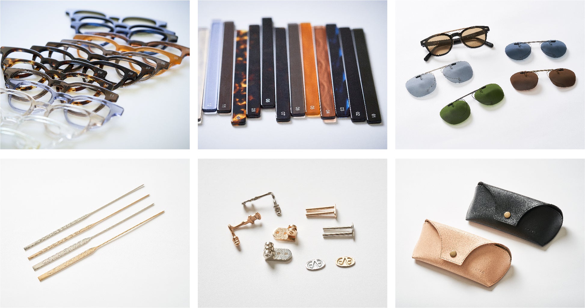 アセテート生地カラーは多種多様な15種類ご用意し、インラインにはない組み合わせも実現可能です。ノーズパッドや各種金具パーツも、思いのままにカスタマイズ。