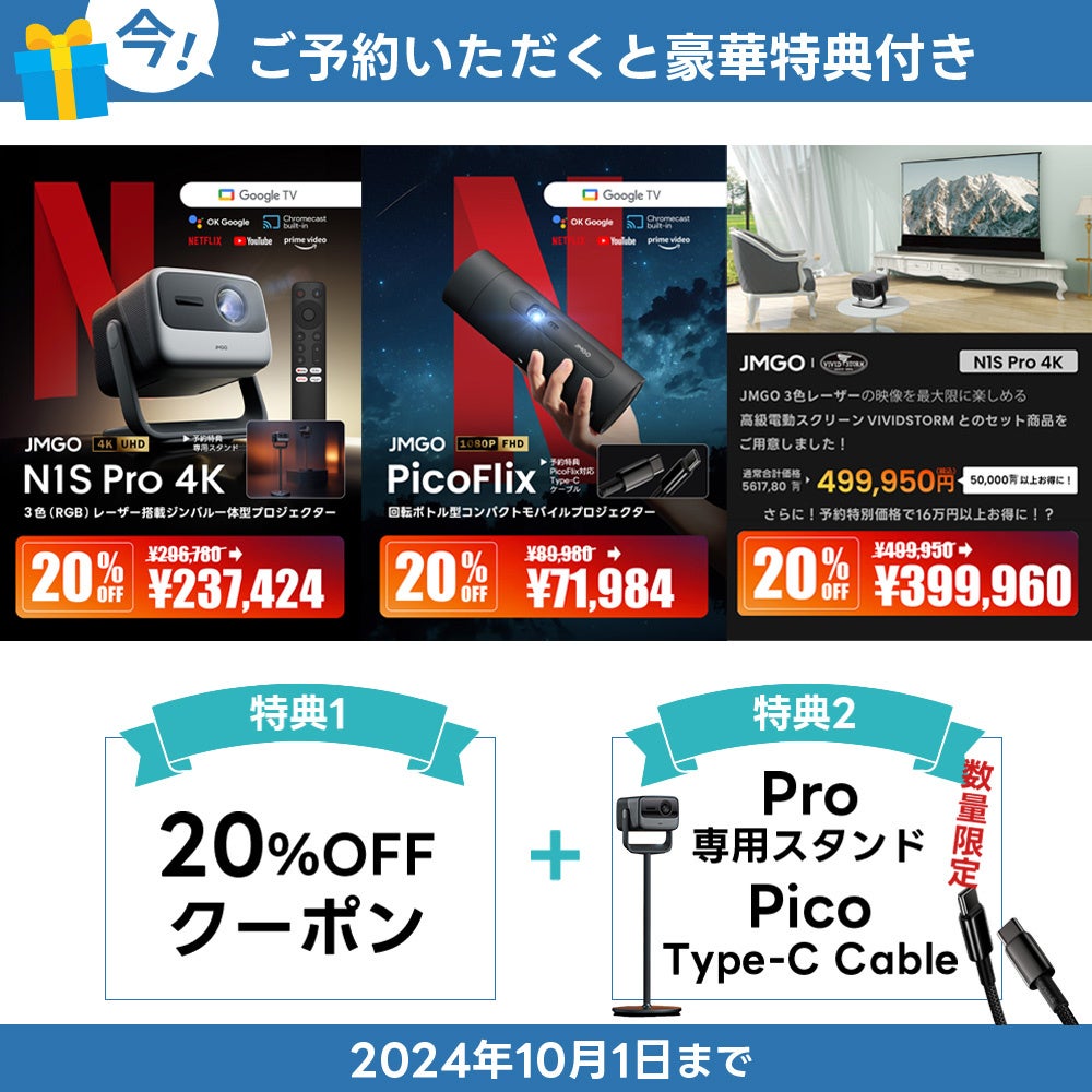 株式会社日本ビジネス開発(所在地:東京都千代田区、代表取締役社長:矢野 雅也)は、2024年9月17日(火)より、JMGO社が製造する、世界で初めて3色レーザー光源を採用したGoogle TV搭載プロジェクター「N1Sシリーズ」の最新モデル『N1S Pro 4K』及びモバイルプロジェクター『PicoFlix』の予約を開始します。