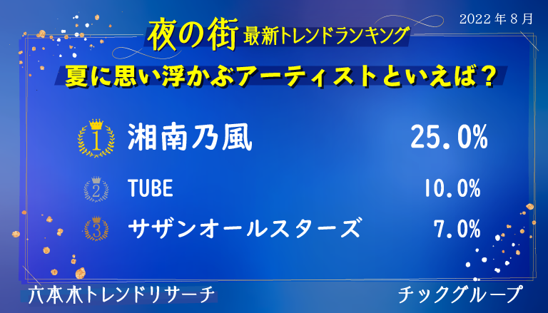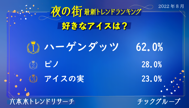 初回調査は「2022夏、夜の街流行調査」として、身の回りで流行しているもの、夏アーティストランキング、好きなお菓子、アイスランキングを調査実施いたしました。