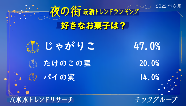 お菓子ランキングではじゃかりこが1位。王道として認知されている一方、巷で論争の起きる「たけのこvsきのこ」は夜の街では「たけのこの里」の声多数でした。尚、きのこの山は10%。