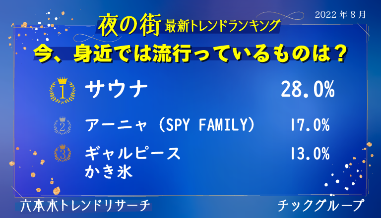 【六本木トレンドリサーチ】2022夏!六本木流行ランキング発表!夜の街では癒やしブーム?“サウナ”“アーニャ”、かき氷&ギャルピースがランクイン