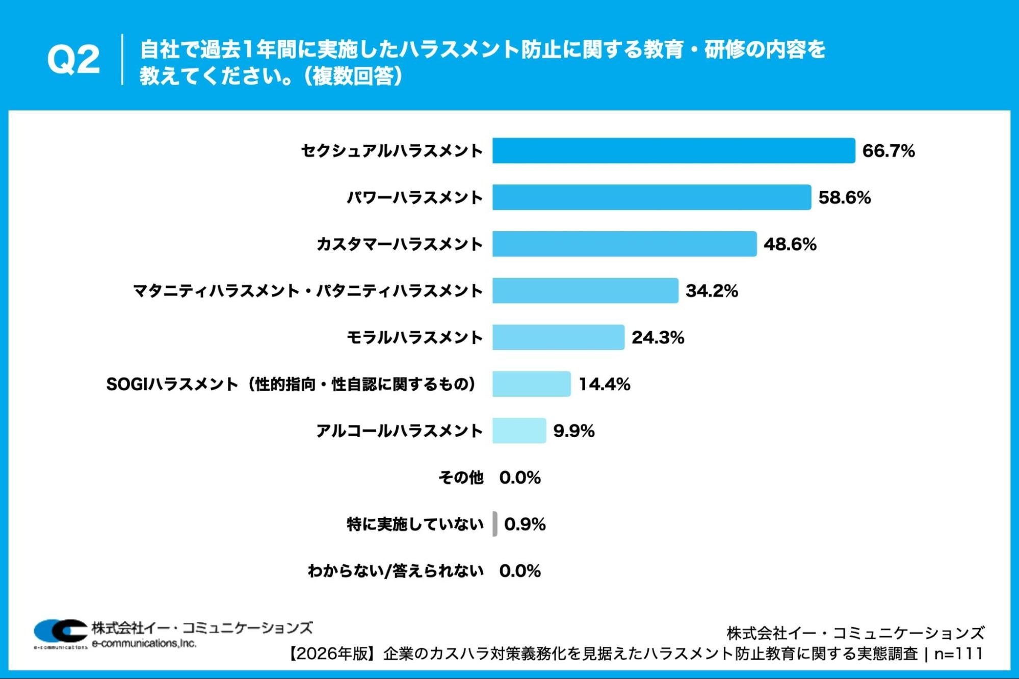 「Q2. 自社で過去1年間に実施したハラスメント防止に関する教育・研修の内容を教えてください。(複数回答)」(n=111)と質問したところ、「セクシュアルハラスメント」が66.7%、「パワーハラスメント」が58.6%、「カスタマーハラスメント」が48.6%という回答となりました。