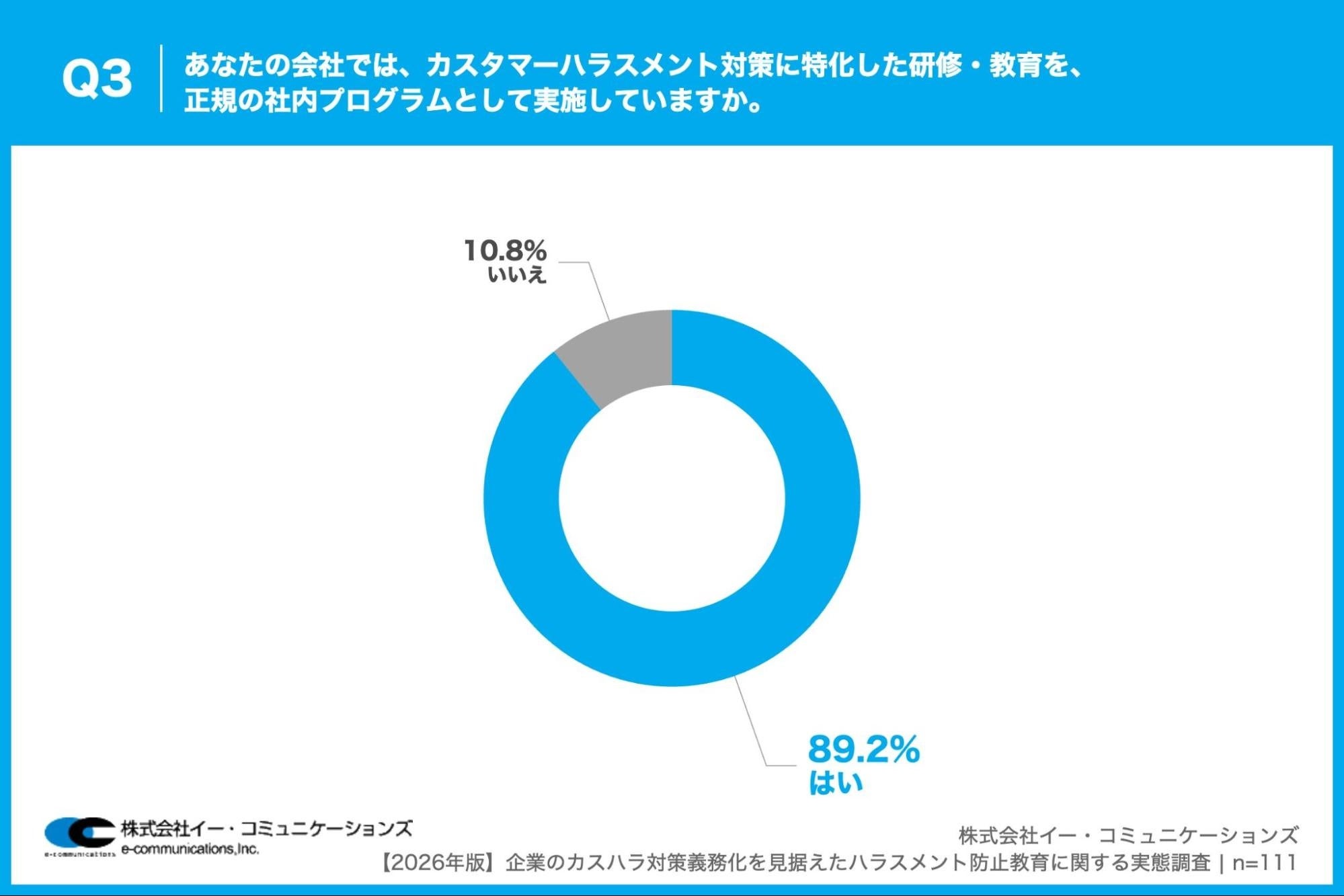 「Q3. あなたの会社では、カスタマーハラスメント対策に特化した研修・教育を、正規の社内プログラムとして実施していますか。」(n=111)と質問したところ、「はい」が89.2%、「いいえ」が10.8%という回答となりました。