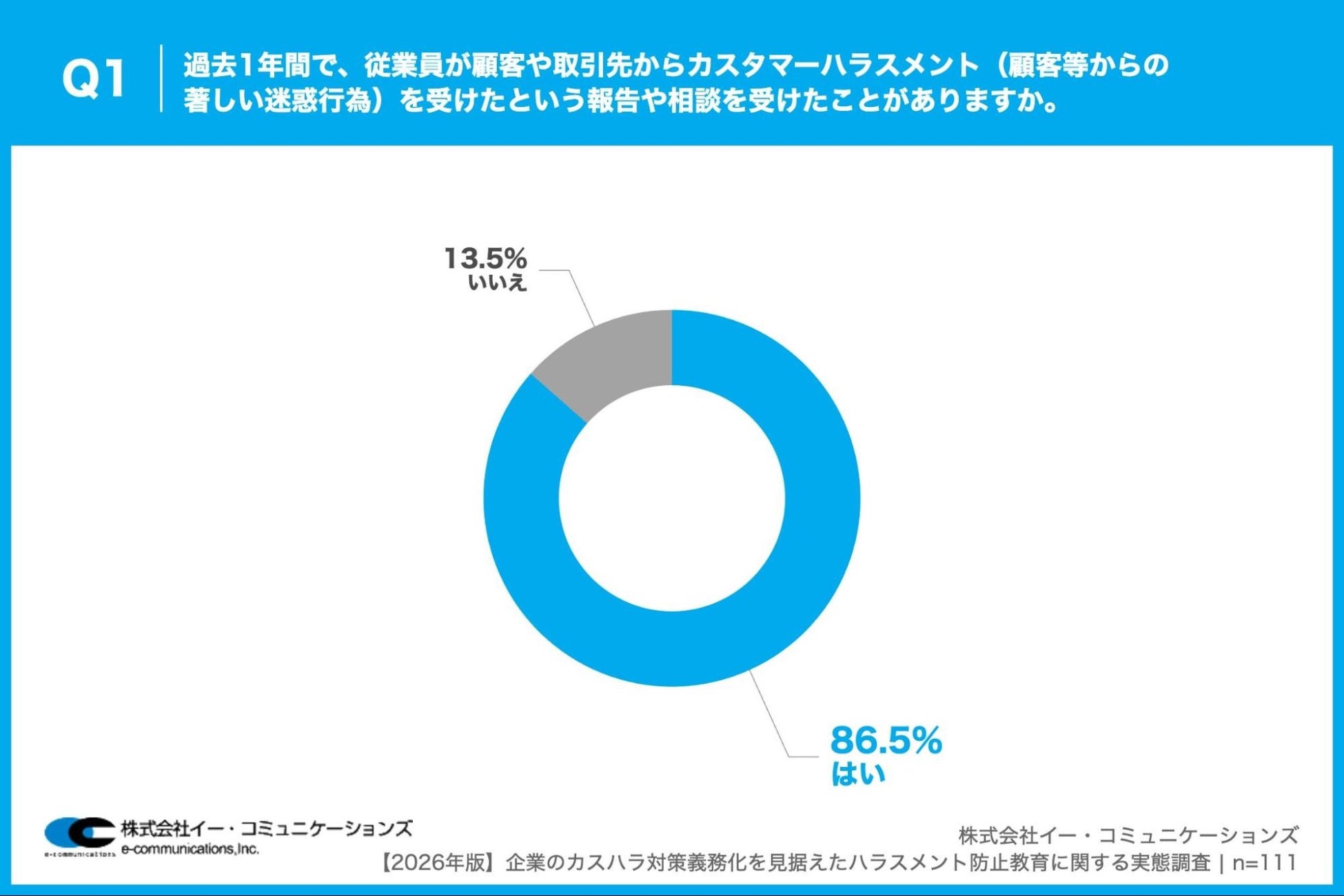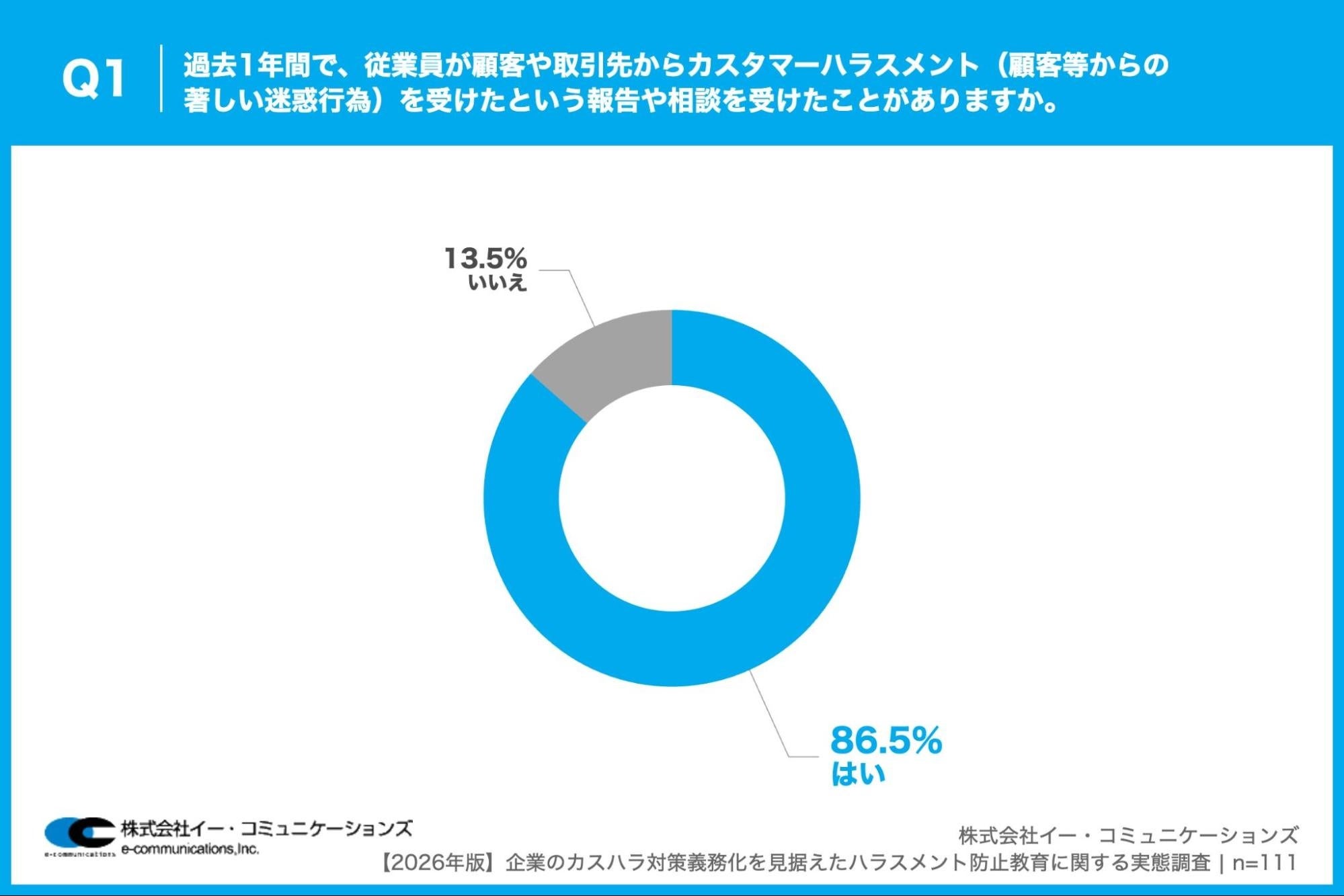 「Q1. 過去1年間で、従業員が顧客や取引先からカスタマーハラスメント(顧客等からの著しい迷惑行為)を受けたという報告や相談を受けたことがありますか。」(n=111)と質問したところ、「はい」が86.5%、「いいえ」が13.5%という回答となりました。