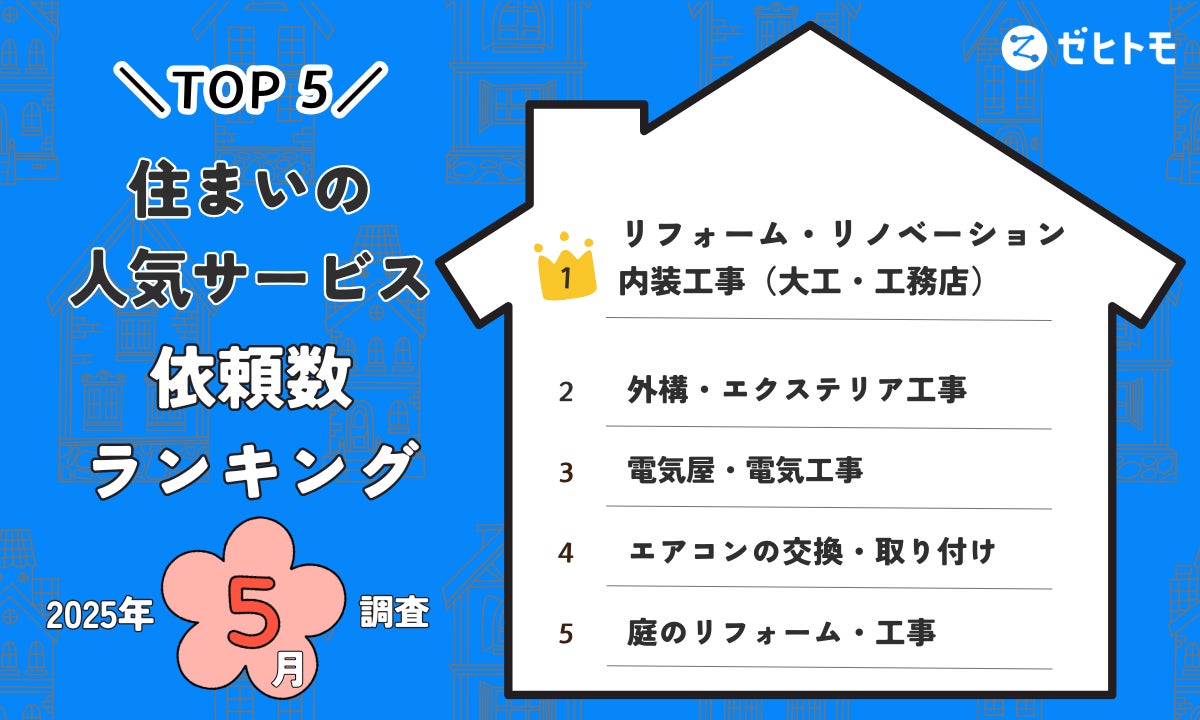 くらしのマッチングサービス「ゼヒトモ」を提供する株式会社Zehitomo(本社:東京都品川区、代表取締役:三浦雄一郎、以下「当社」)は、2025年5月に多くの依頼が寄せられた住宅関連サービスカテゴリのTOP5を発表いたしました。