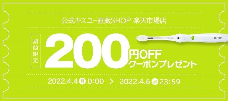 イオン歯ブラシのリーディングカンパニー【イオン歯ブラシ累計販売本数2億本以上の実績】であるアイオニック株式会社(所在地:千葉県流山市、代表取締役:西川 満、以下「アイオニック」)は、2022年4月4日(月) 0:00~2022年4月6日(水) 23:59まで公式キスユー直販SHOP楽天市場店で【期間限定200円OFFクーポン】プレゼントキャンペーンを開始いたしましたので、お知らせいたします。