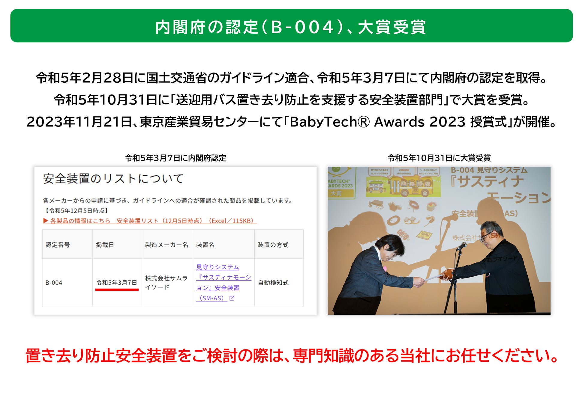 B-004 見守りシステム『サスティナモーション』安全装置は、2022年経済産業省・中小企業庁及び独立行政法人中小企業基盤整備機構に採択され、2023年3月の内閣府・こども家庭庁に認定された製品です。