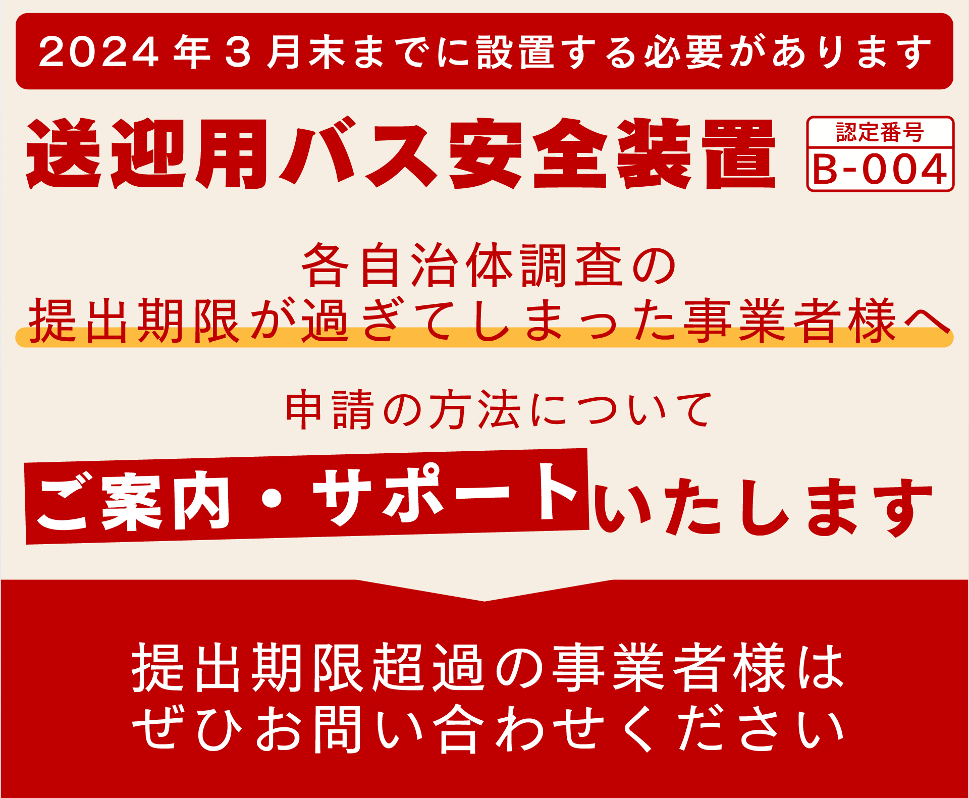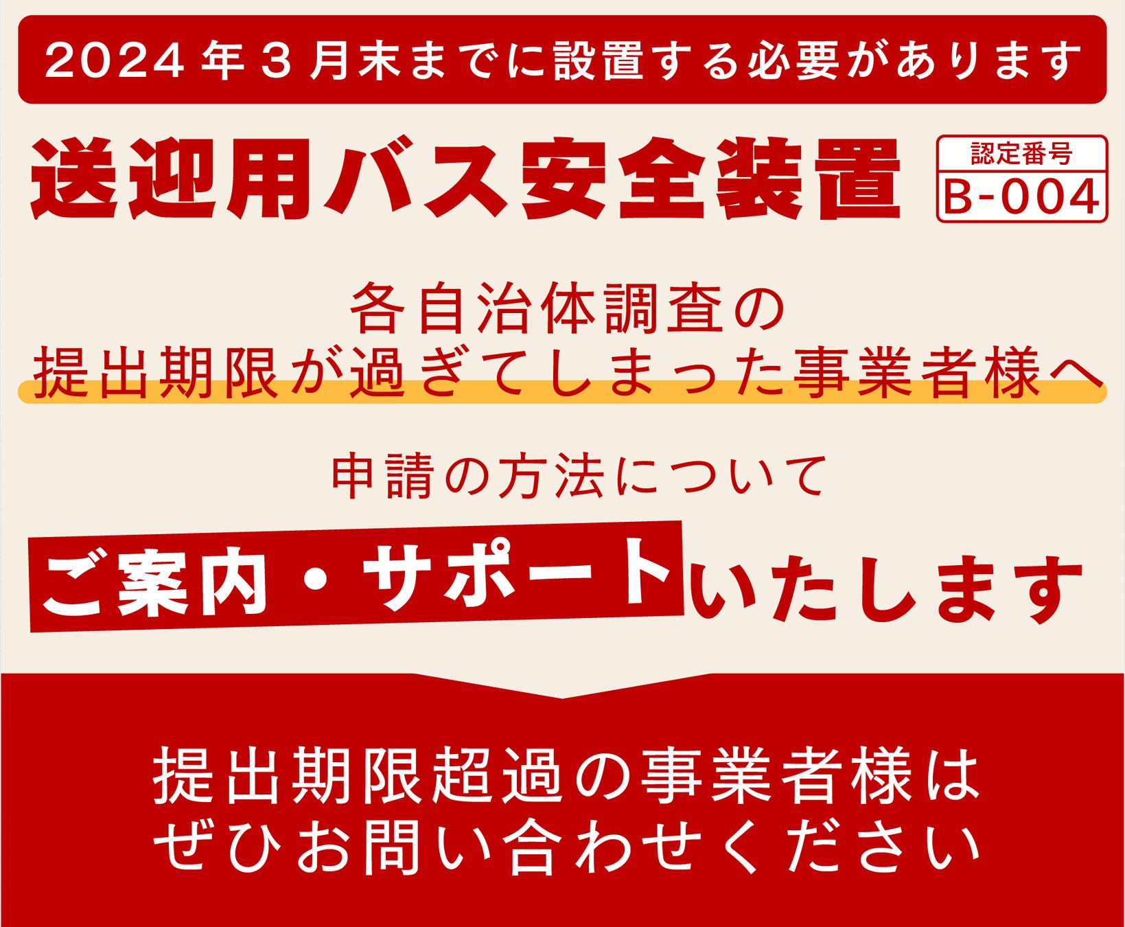 【送迎用バス安全装置B-004】当社では各自治体調査の提出期限が過ぎてしまった事業者様へ申請の方法についてご案内サポートしています。