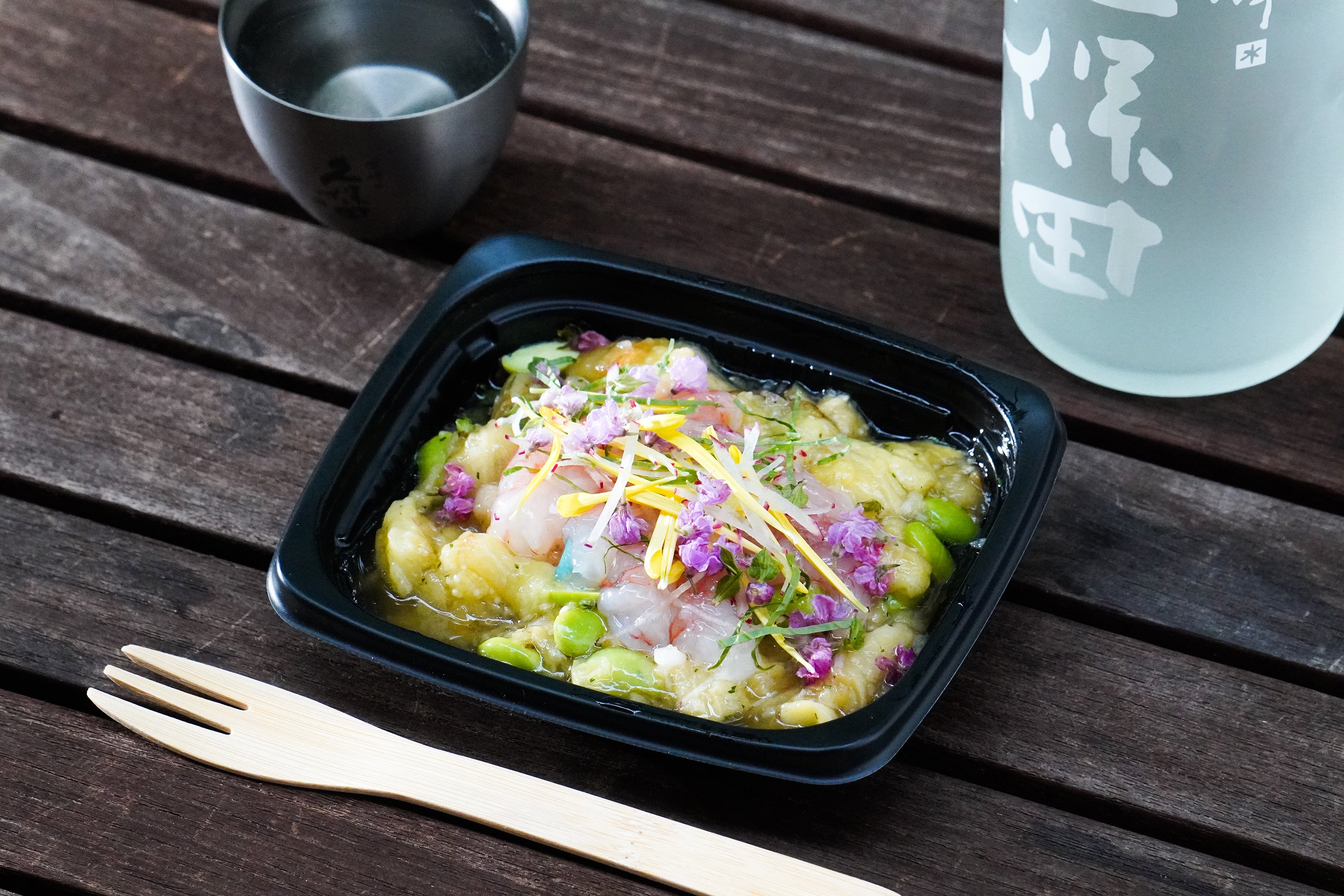 焼き茄子の香ばしさに、南蛮海老のねっとりした甘さを加え、赤ワインビネガーと太白胡麻油をベースに和えた優しい酸味が爽やかなマリネです。紫蘇の花や菊、わさびの葉、ラディッシュなどが彩りとみずみずしい食感を添えています。