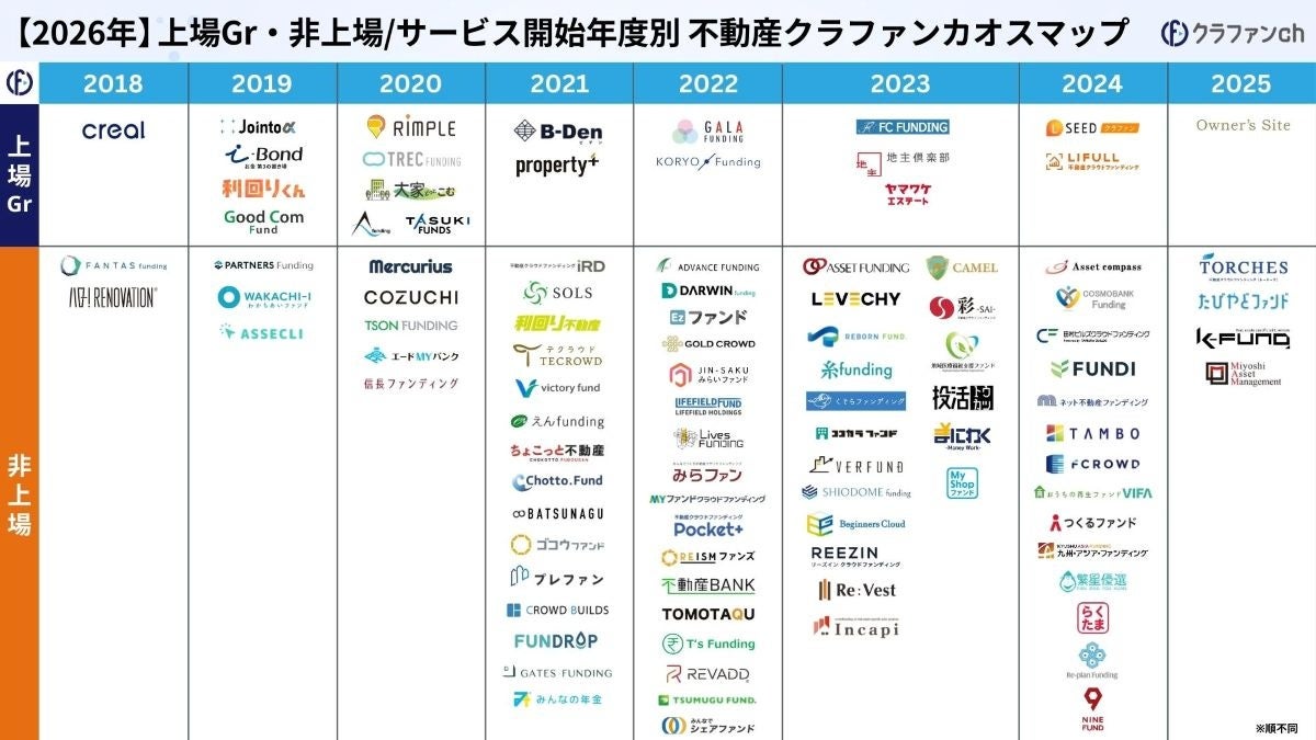 グローシップ・パートナーズ株式会社(本社:東京都港区、代表取締役:松井晴彦)の運営する投資型クラウドファンディング専門メディア「クラファンch」は、2026年時点で運営されている不動産クラウドファンディングサービスを整理した最新版カオスマップを公開しました。