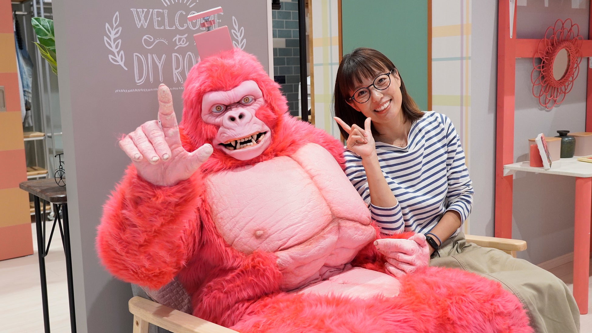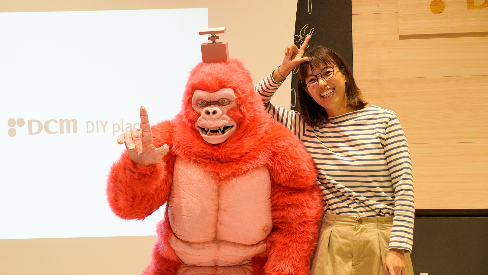 「DCM DIY place」1周年記念イベントに初お披露目のラブリーコングとつっぱり棒博士が登場