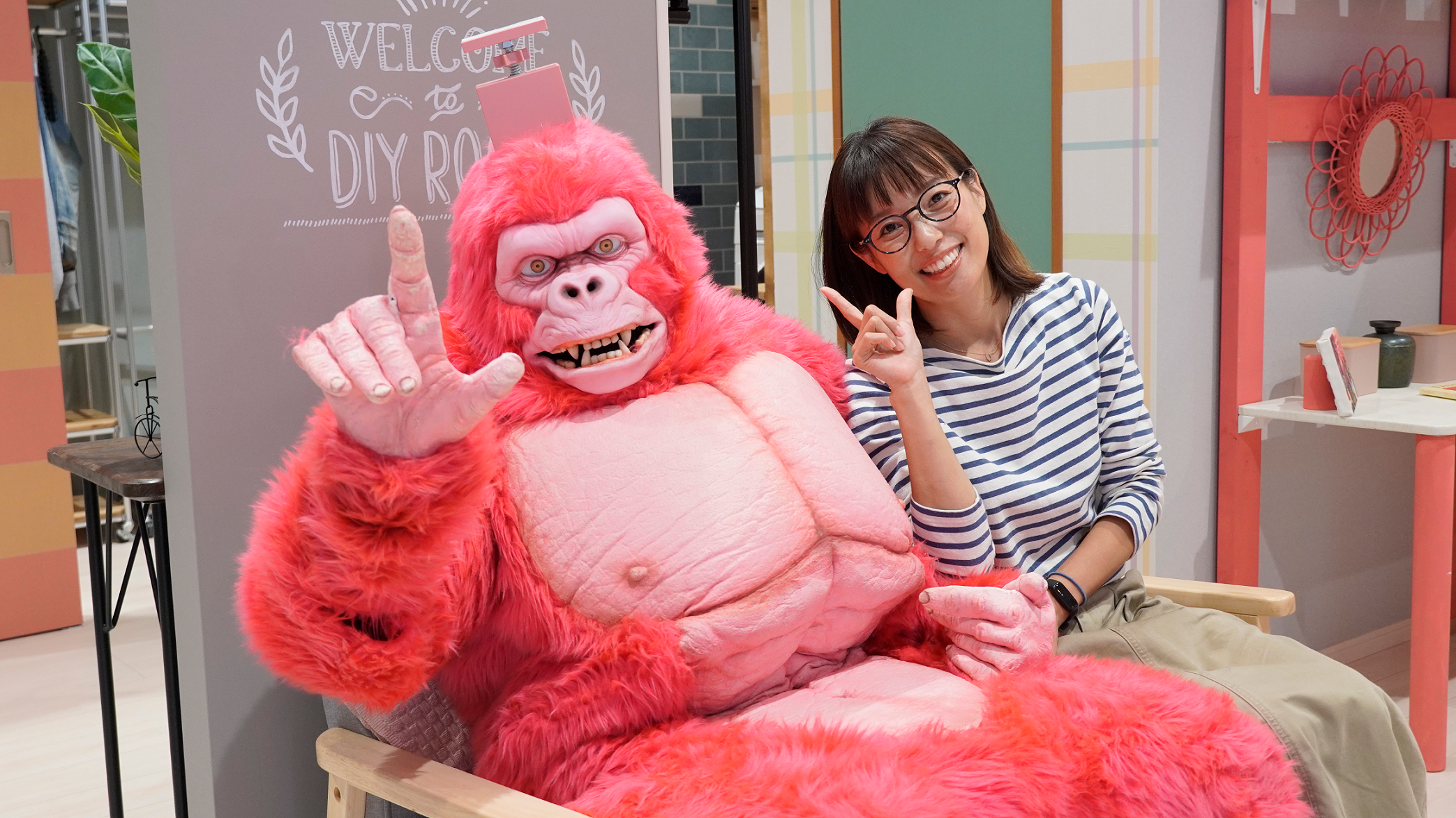 突然の怪人登場に驚きながらも「色がピンクでかわいい」と笑顔の井上さん。「ラブリコは賃貸でもDIYができる、まさに魔法のアイテムだと思う。私の家も賃貸で壁に穴があけられないので、これで壁を作って絵を飾りたい。」とお話いただきました。