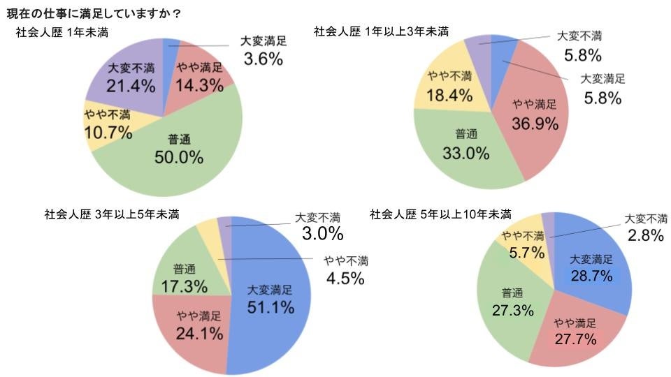 ・社会人1年未満で現在の仕事に「大変満足」「やや満足」と回答した人は2割弱であったが、社会人3年以上5年未満では約7割と増加した。