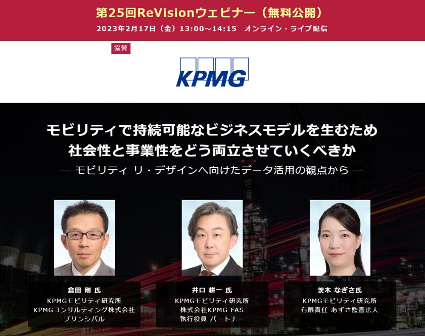 【無料公開WEBセミナー】 KPMGモビリティ研究所から講師を迎え、「モビリティにおける持続可能なビジネスモデル」について講演・議論をライブ配信 ― 2月17日(金)