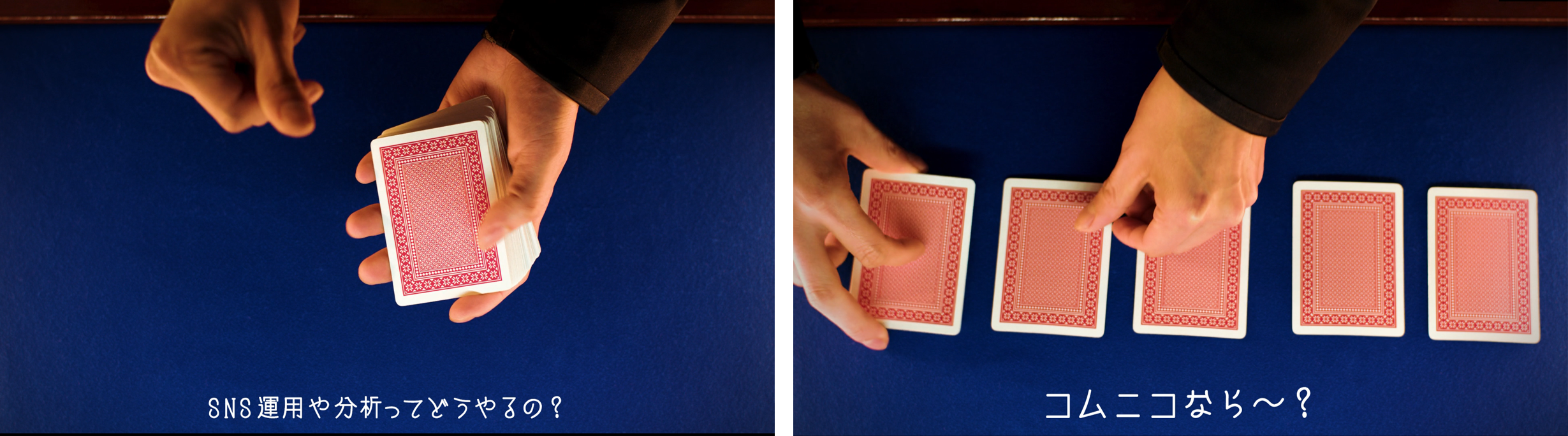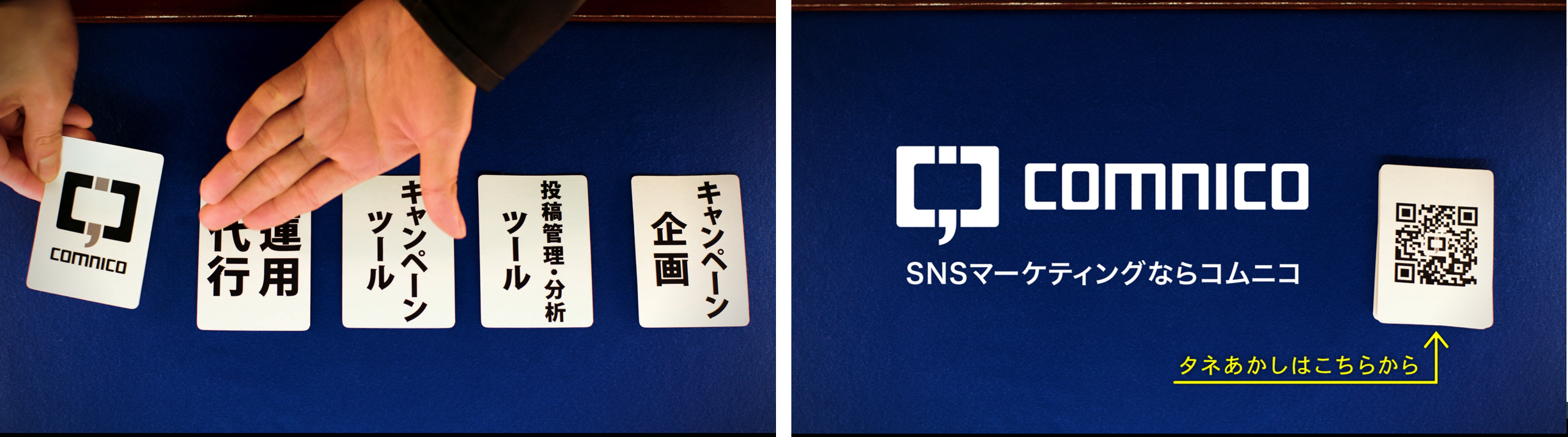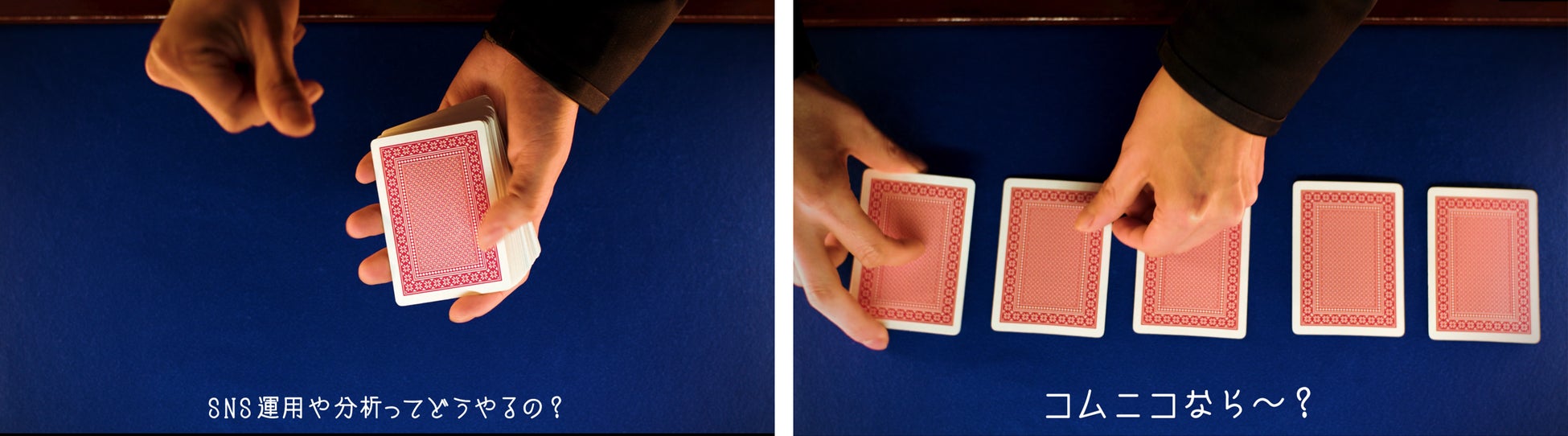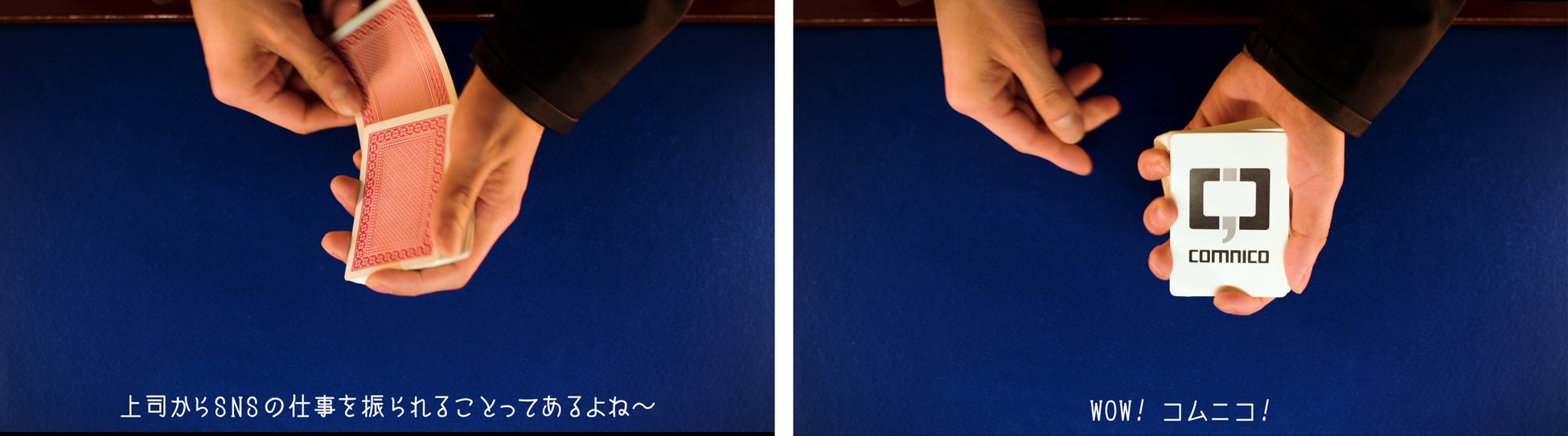 本CMは、カードマジックを通して「コムニコ」の社名やサービス内容を訴求する内容となっており、SNSマーケティングの総合代理店として、お客様の課題に対して様々な手法をご提案できることや、特定のプラットフォームや業界・商材に限らず幅広くご相談いただけることを“手札”で表現しています。また、SNS広告はミュートで(音を出さずに)視聴する方も多いことから、BGMやナレーションがなくても内容が楽しめる・理解できる動画となっております。