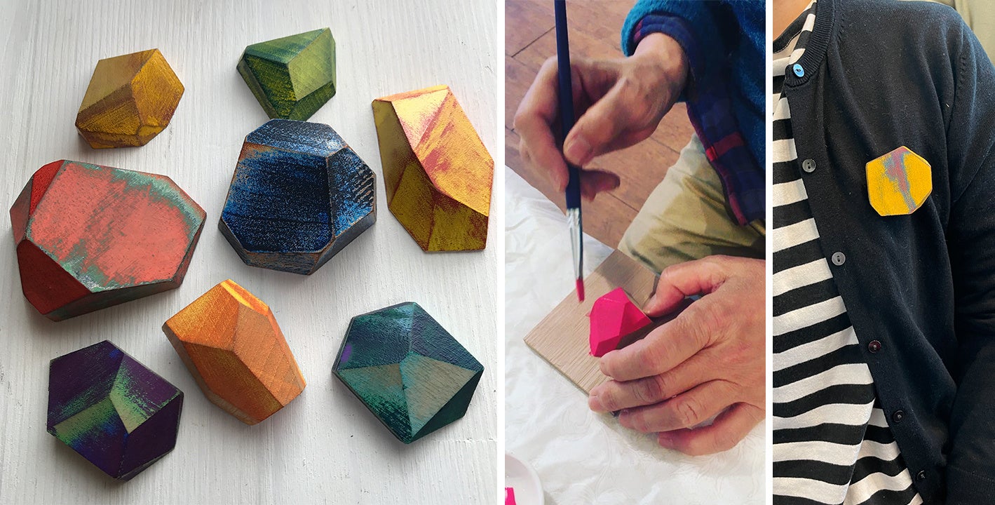 作家がカットした木片の中から気に入ったカタチを選び、絵の具を3色塗り重ね、そこからヤスリを使って色を研ぎ出します。完成した作品はブローチかマグネット、オブジェとしてお楽しみください。