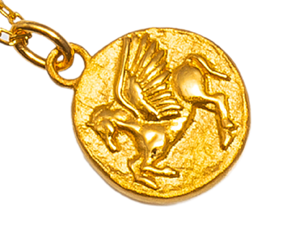 ペンダント、ブレスレット、ピアスの純金製チャームのモチーフとしてペガサスを採用しました。チャームの表面はアンティークコイン風に仕上げており、男女問わず着用できるシンプルなデザインです。繊細なチェーンネックレスに純金のペガサスが輝きます。
