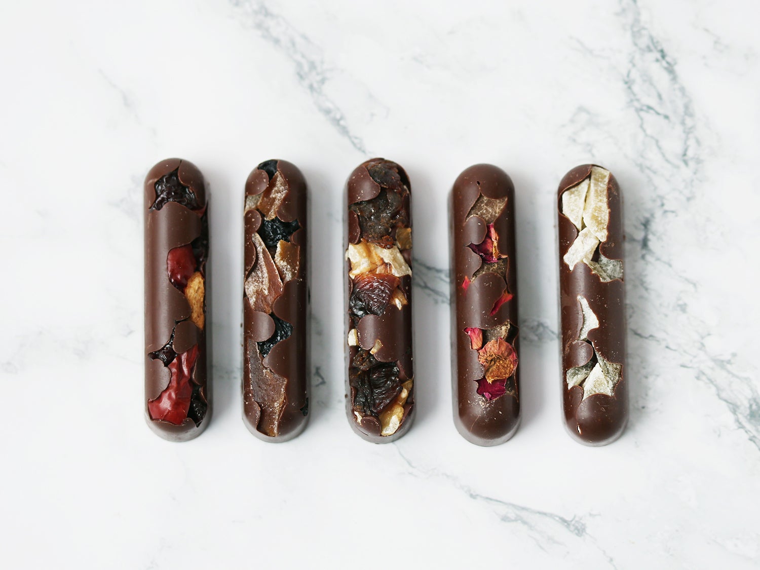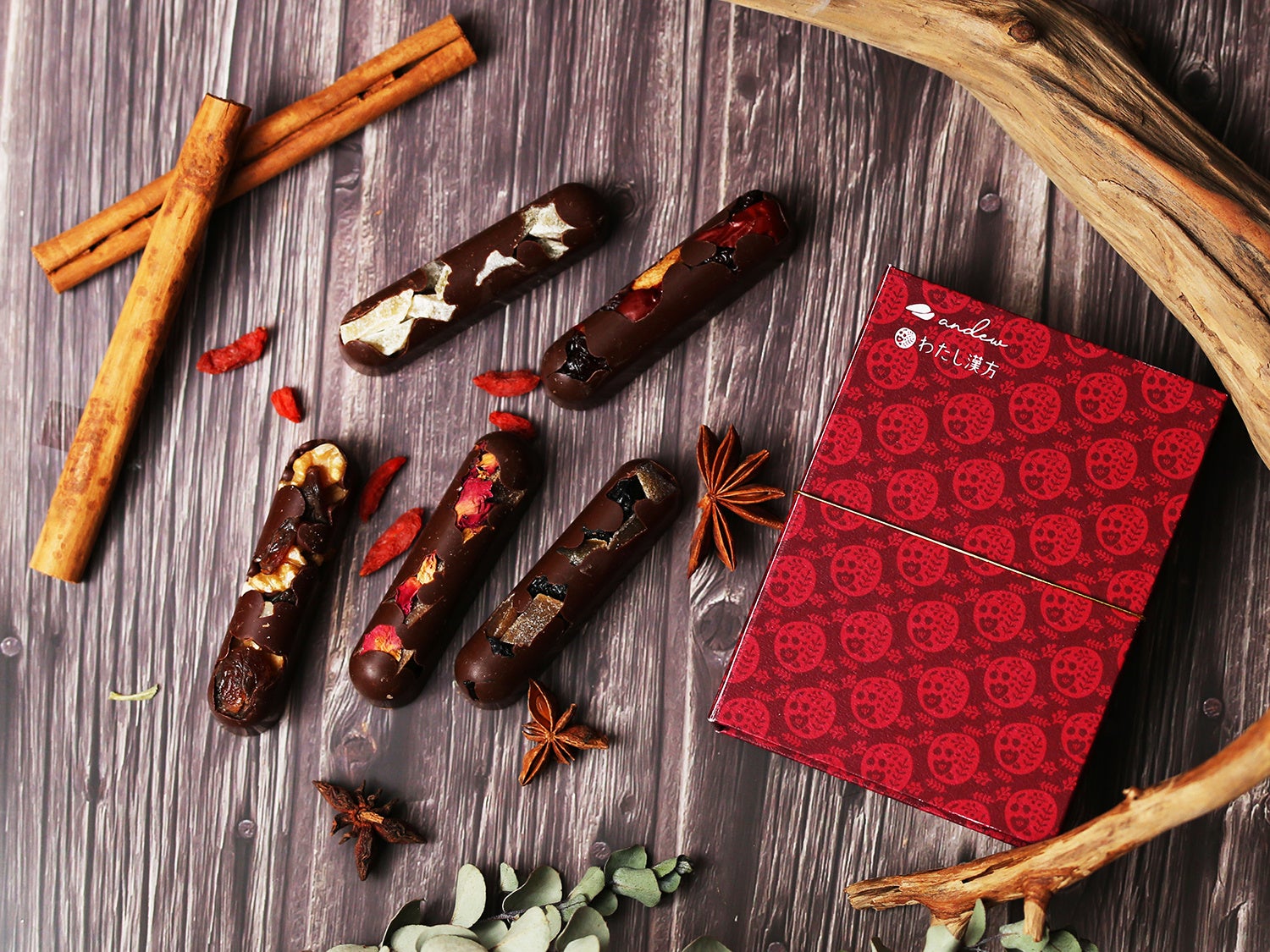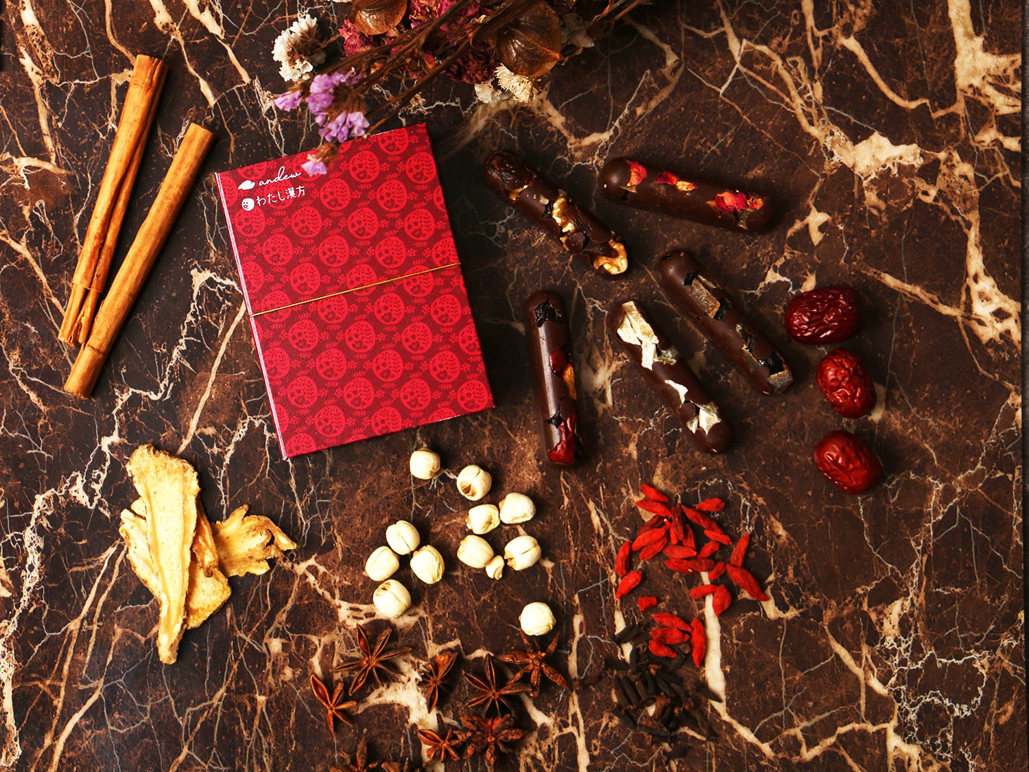 ベースのチョコレートは、カカオに加え、アーモンド、チアシード、ココナツ、きなこ、抹茶、ポピーシード、昆布などの栄養豊富なスーパーフードがたっぷり。さらに、なつめ(棗)やさんざし(山査子)、生姜などの薬膳食材を、ごろっと大きな果肉のままチョコレートに。