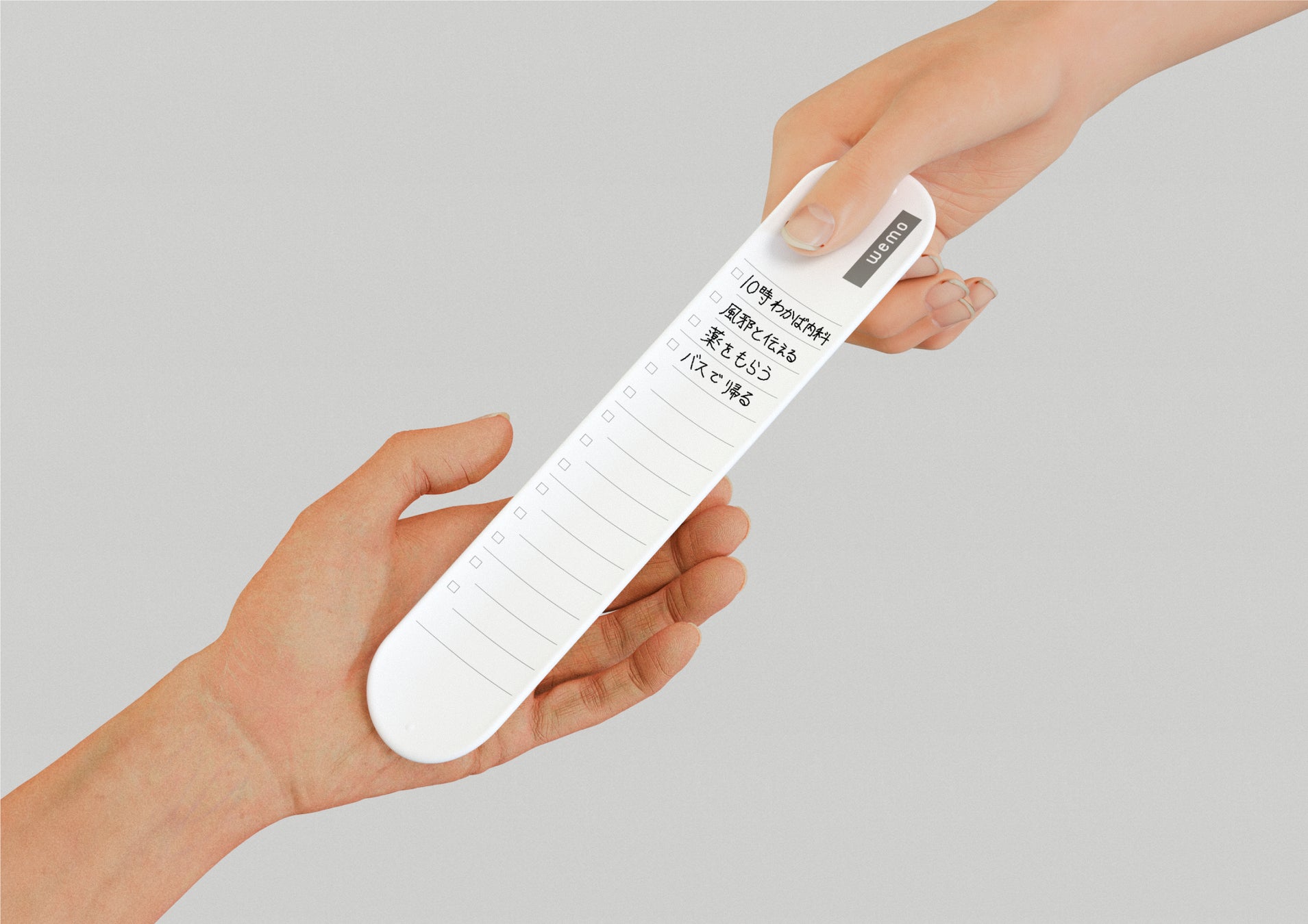 wemo®は、”記憶に対するストレスを軽減する”ことを哲学としているウェアラブルメモブランドです。医療・介護の現場、災害、農水産、製造・建設など、幅広い分野のデスクレスワーカーに向けて開発された「wemo® バンドタイプ」は油性ボールペンで書いて、消しゴムで消すことができ、何度でも使用できます。常に身に着けておけることで、とっさに書き留めたいことがあったときにメモ帳を取り出すわずらわしさや、書いた内容を忘れてしまうといった”記憶に関する物理的/精神的負担”を軽減します。