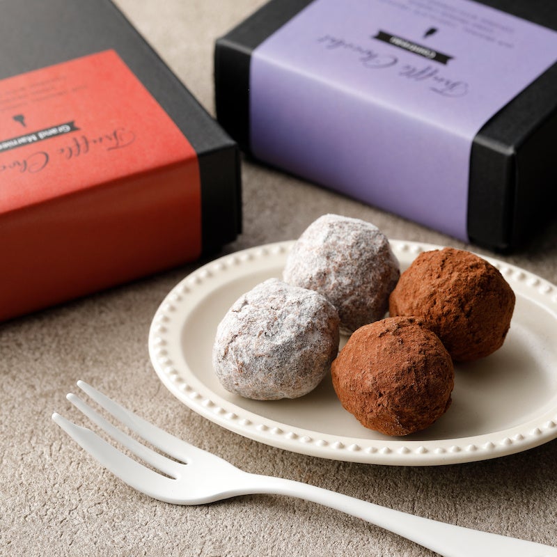 『トリュフショコラ・コアントロー』はミルクチョコレートに、オレンジの苦味を抑えた甘みのある銘柄「コアントロー」を使用しました。パウダーシュガーをまぶし、オレンジの香りが広がる味わいに仕上げています。(アルコール分4.1%)