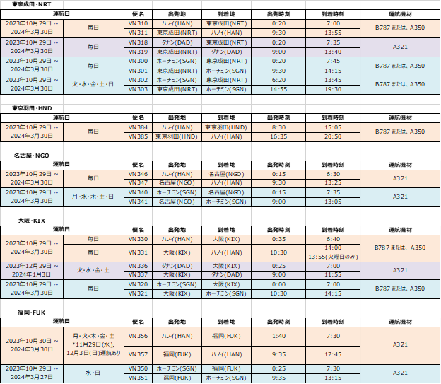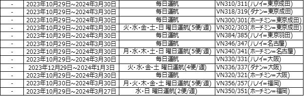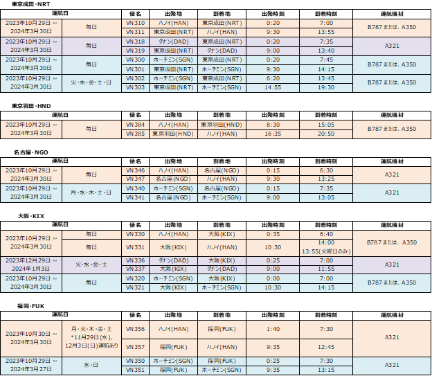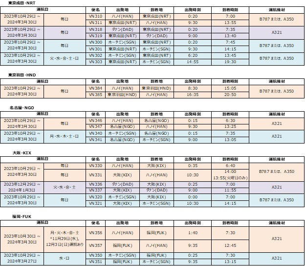 ベトナム航空(日本支社 所在地:東京都千代田区、総支配人:ゴー・シー・アイン)は、2023年10月29日(日)から2024年3月30日(土)までの冬季運航スケジュールを発表しました。