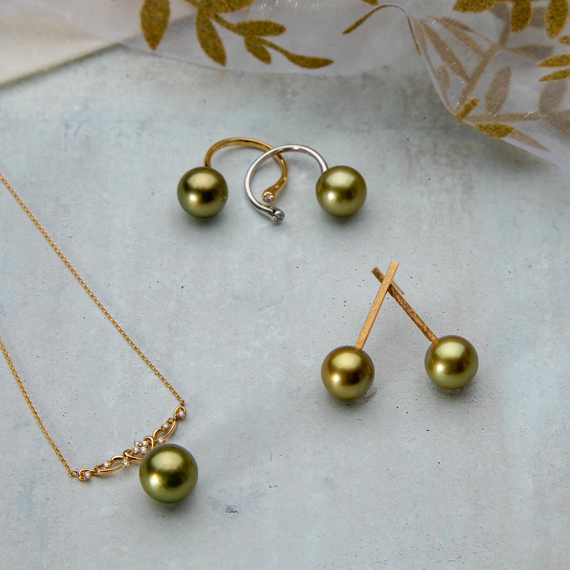 南洋ゴールデンパール「le Soleil」/タヒチ黒蝶真珠「Pistachio」/有核淡水パール「Mauvette」