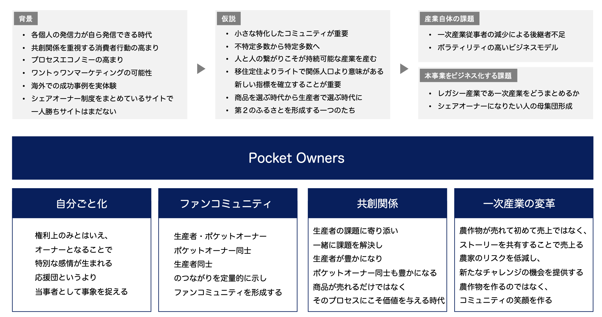 Pocket Ownersのキーワードは、4つあります。それは「自分ごと化」、「ファンコミュニティの形成」、「生産者と消費者・消費者同士の共創関係」、それらを実現することによる「一次産業の変革」です。