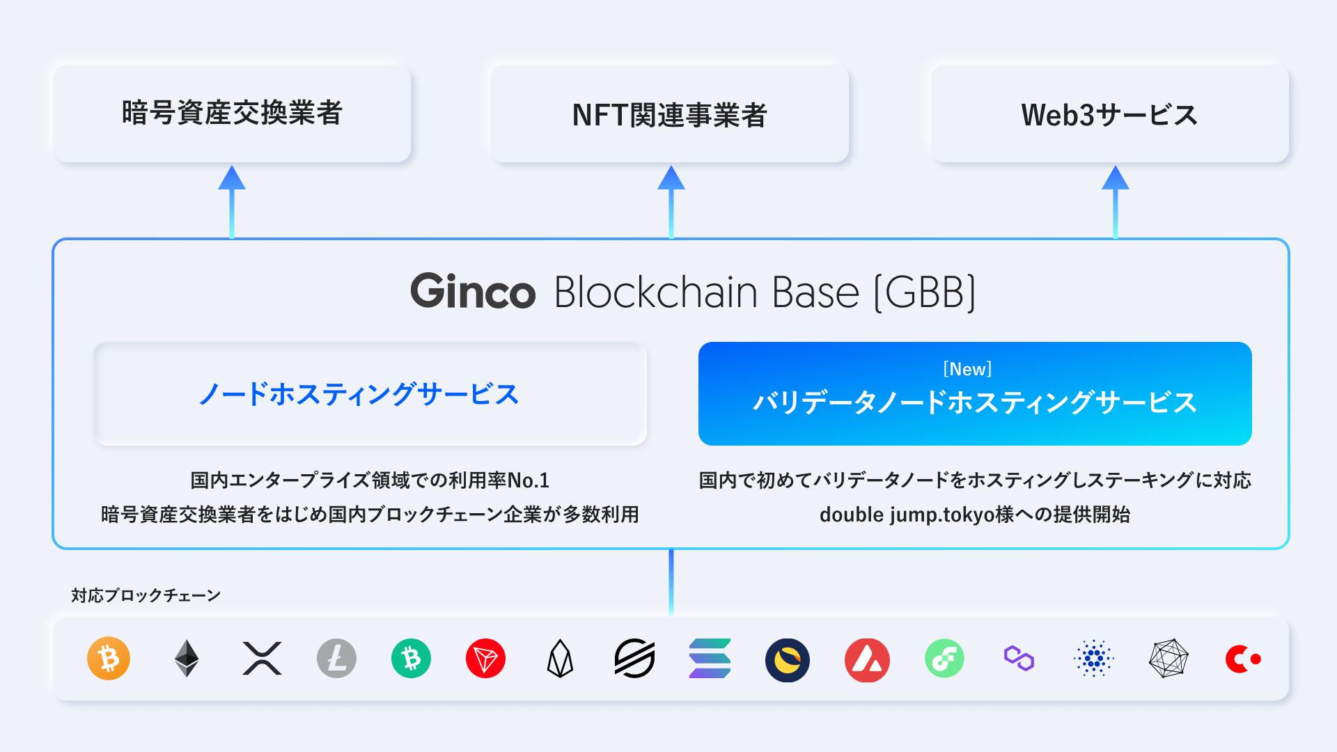 企業の効率的かつ迅速なブロックチェーン活用を支援するクラウド型インフラとして「Ginco Blockchain Base(以下、GBB)」を提供する株式会社Ginco(本社:東京都中央区、代表取締役:森川夢佑斗、以下当社)は、Web3時代に重要な役割を担うバリデータノードをフルマネージドでホスティングするサービスを開始し、GBBのラインナップに追加します。加えて、double jump.tokyo株式会社(本社:東京都新宿区、代表取締役:上野広伸、以下DJT社)へ同サービスを提供することをお知らせいたします。