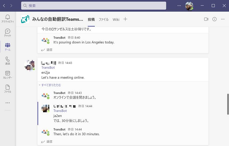 そこで、多くの企業で使われているコラボレーションツール「Microsoft Teams」において、ユーザーがチャット内で投稿したメッセージを当社のクラウド機械翻訳サービス「みんなの自動翻訳@KI(商用版)」を用いて安全に翻訳することができる連携機能を開発しました。