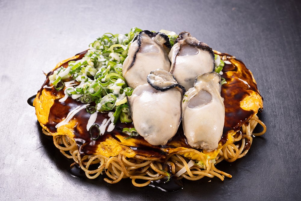 ボリューミーな広島風お好み焼にたっぷりのねぎと牡蠣がコラボ!