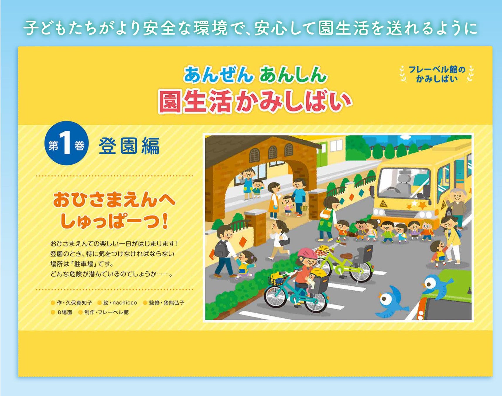 2022年夏、通園バスに置き去りにされた園児が熱中症で命を落とすという痛ましい事故が発生しました。子どもが安全に過ごせる環境をつくることは大人の責務ですが、それでもなお完全に危険を拭い去ることはできません。この商品は、子どもたちが安心して園生活を過ごすために、自分自身で身の周りに潜む危険を知り、回避する力を育むための紙芝居です。