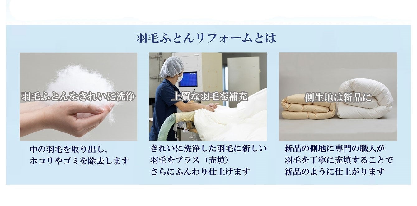 羽毛ふとんリフォームの工程は、①羽毛ふとんを解体 ②取り出した羽毛の洗浄・除塵・乾燥 ③足し羽毛 ④新しい側地へ充填、最後に異物の混入などがないか確認して出荷します。作業に際しては、ほかの顧客のふとんと混在しないよう、徹底した個別管理の下でお客様の羽毛ふとんを1枚1枚加工いたします。