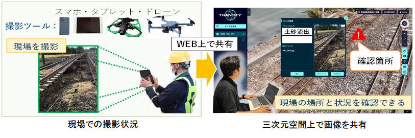 「TRANCITY」は、小型ドローンやスマートフォン等で撮影した動画をアップロードするだけで、電子地図上に点群が自動で生成されます。また、BIM※2データや点群データも重ねて表示することができ、それらのデータを時系列表示して管理することが可能です。今回、鉄道事業をはじめとする多くのインフラ事業や製造業等からいただいたご意見を踏まえ新機能を開発しました。
