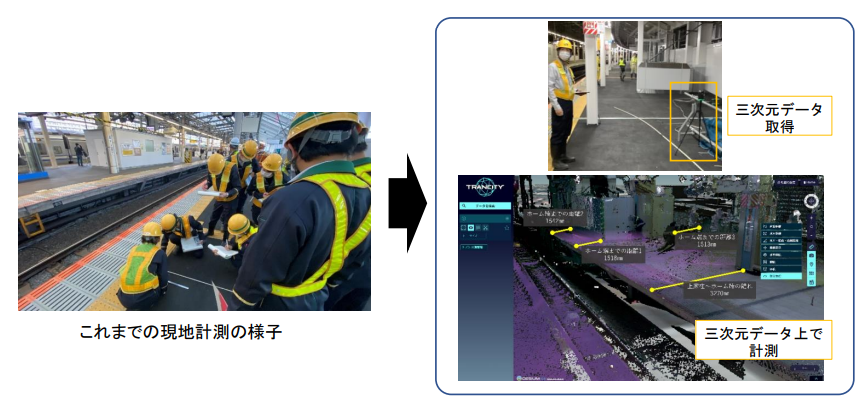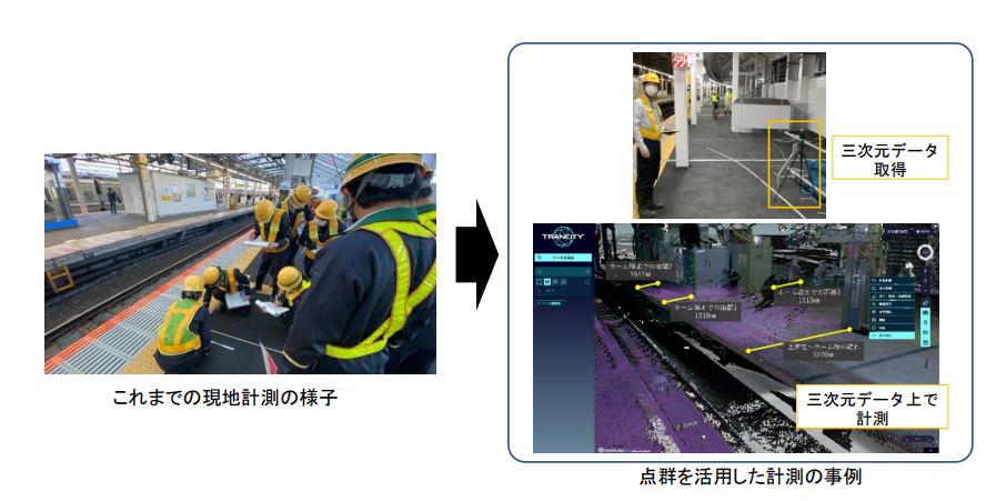 JR東日本では鉄道設備の改良・新設をする際に、鉄道設備の計測を行っています。これまでは、多くの社員が現地に赴き、計測した結果を記録していましたが、少人数で三次元データを取得し、計測をデジタル空間上で行うことで、計測作業や帳票作成作業の省力化を進めています。今回の「TRANCITY」のアップグレードにより、計測記録のデジタル化の推進が期待できます。