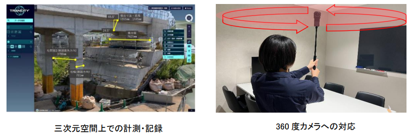 〇 「TRANCITY」は新たな機能として、計測結果のデジタル記録、三次元空間上での画像・PDFなどのデータ共有、3Dウォークなどを実装します。