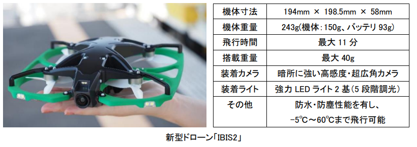 「IBIS」は、屋内空間に特化して開発された小型ドローンで、狭小空間や高所、危険な箇所を人の代わりに調査します。鉄道施設をはじめ、多くのインフラ設備点検に活用する中で寄せられた様々なニーズへ対応するため、「IBIS2」を開発しました。